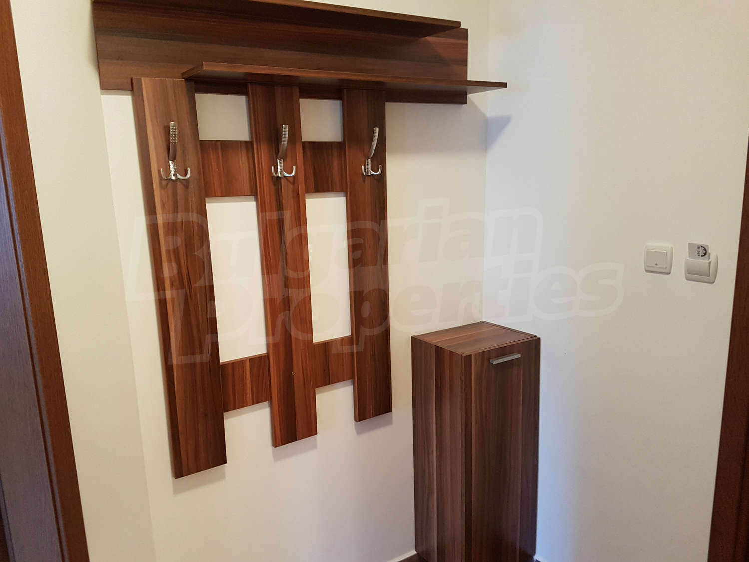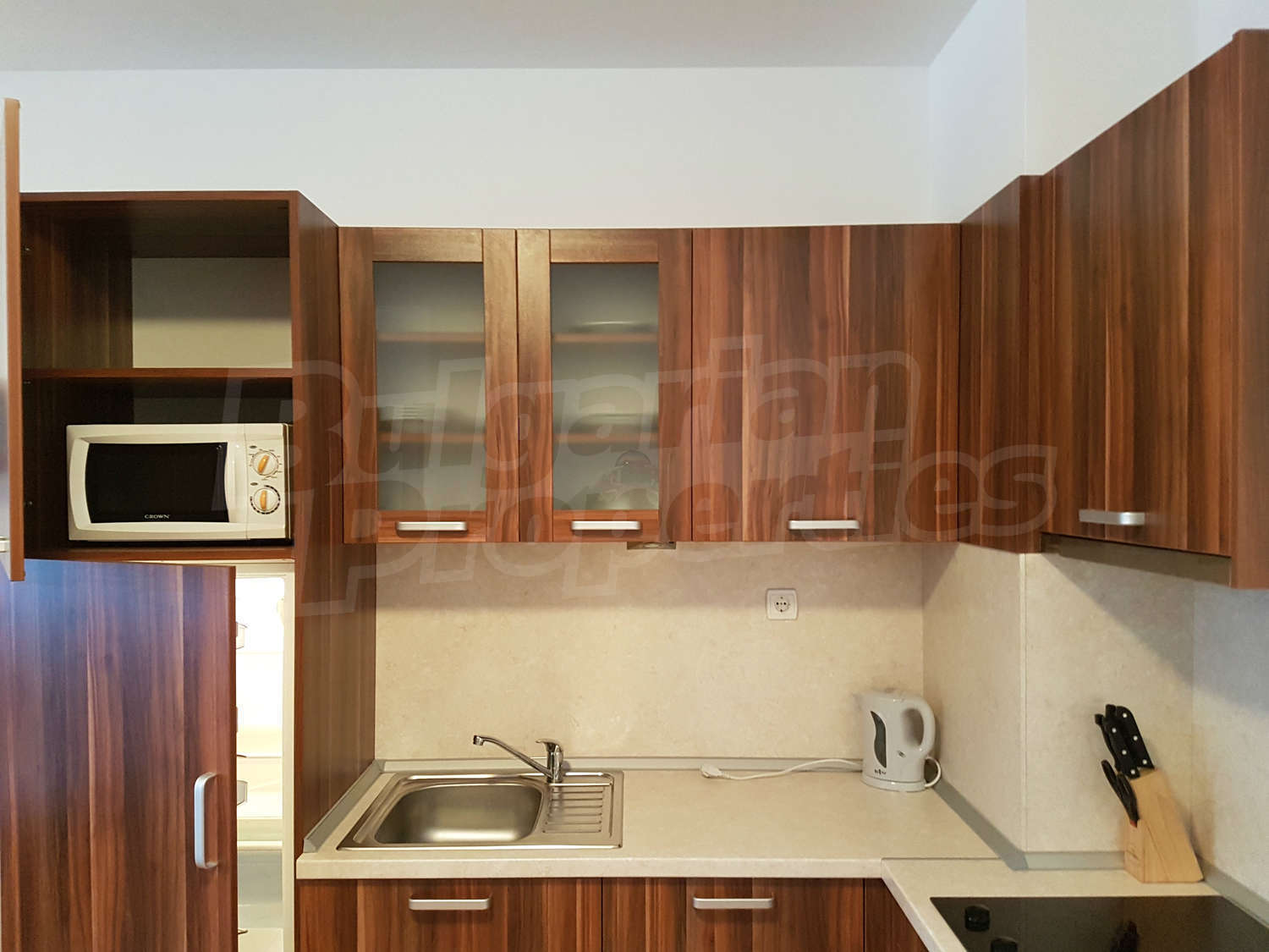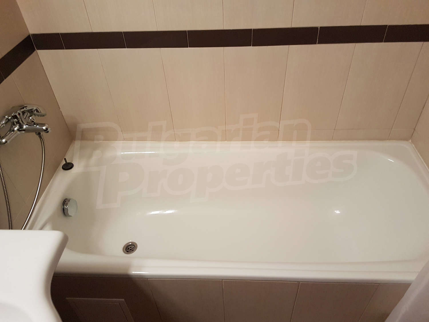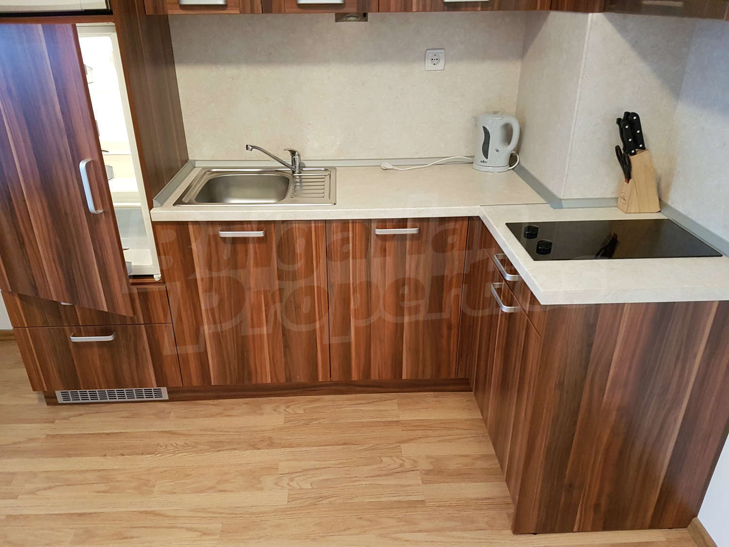 The apartment is located on the second floor, facing west, with a total area 70.94 sq.m. (net area - 53.96 sq.m. + common parts - 16.98 sq.m.). The flat is distributes between a bathroom / wc, a balcony, an open-plan kitchen, a living room. The rooms have painted walls, laminate flooring and granite tiles in the hallway, wooden window frames. The kitchen is equipped with a ceramic hob, sink, cabinets, refrigerator, table with 4 chairs; living room - with a sofa, coffee table, TV set; bedroom with a double bed, two bedside tables, wardrobe, chest of drawers; bathroom with toilet, bathtub, sink with mirror. The heating is with electric convectors Adax. The apartment is equipped with cable TV and internet. The building has an elevator and porter.