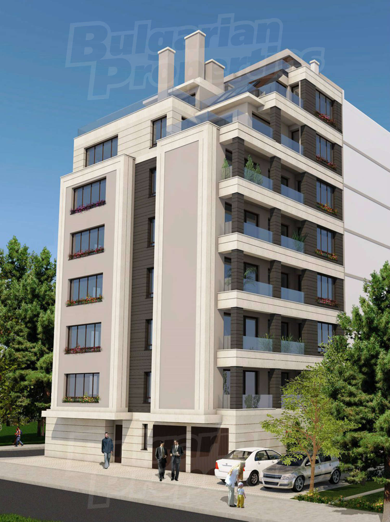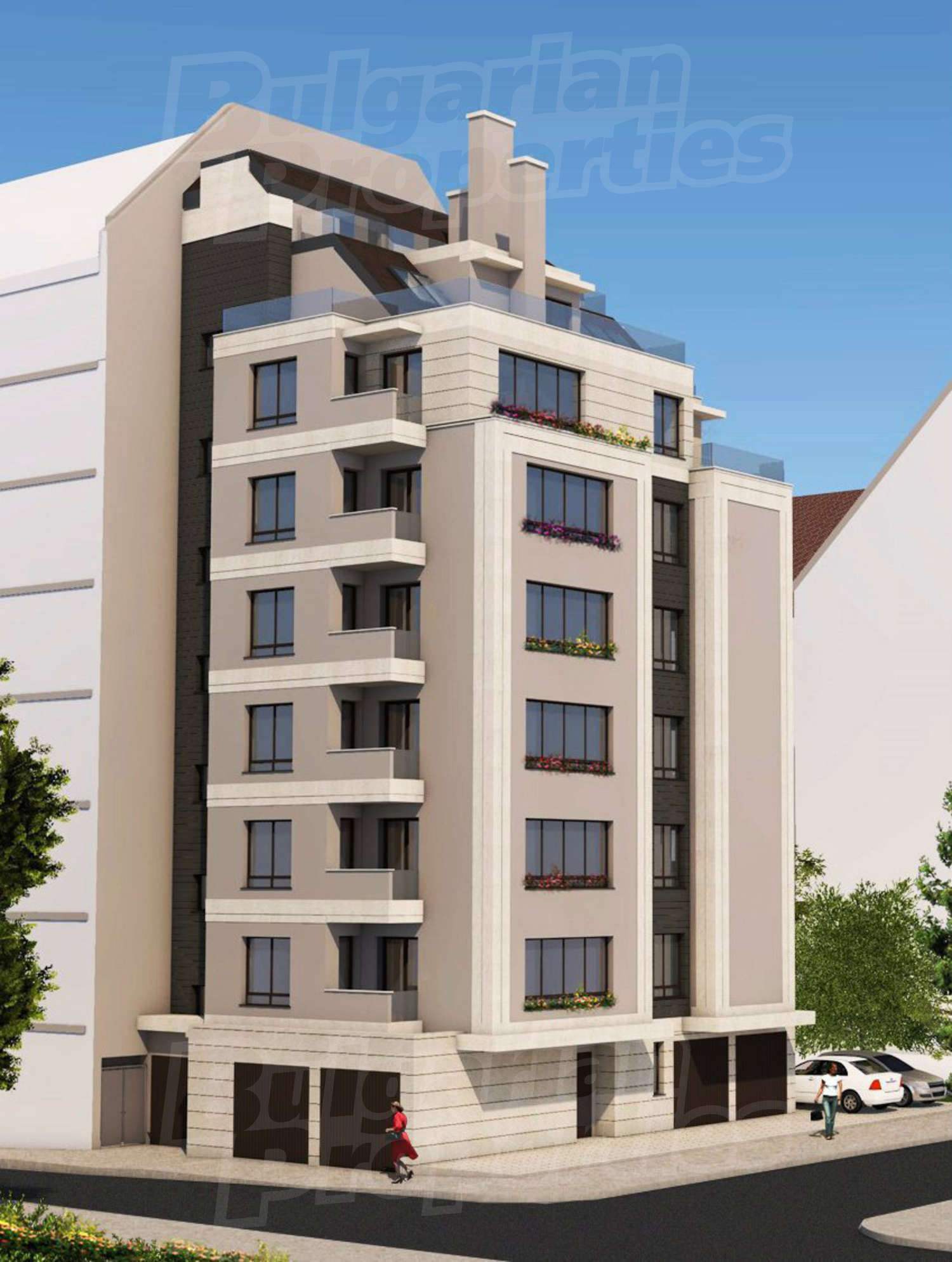 The building is on 9 floors with west and south exposure and park views, from the higher floors: view to Vitosha Mountain. On the ground floor there are garages, the rest of the floors accommodate the apartments, with a distribution of only 2 functional and properly located apartments per floor.