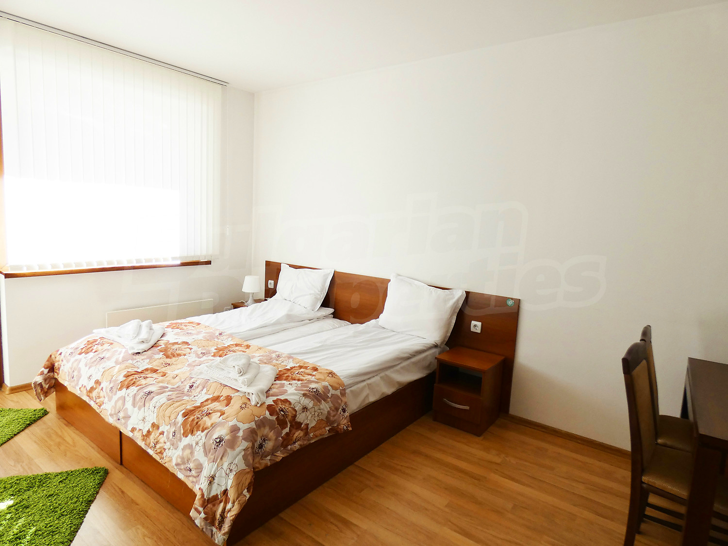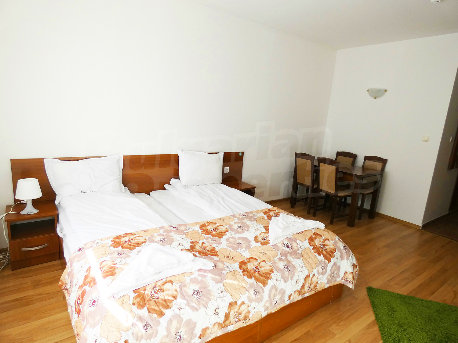 The apartment is offered for sale fully furnished and equipped, with pleasant eastern exposure. The property has a total area of 46.12 sq.m., net area - 35.53 sq.m. + common parts - 10.59 sq.m., divided into one large room with separate sleeping, dining and relaxation areas, a bathroom with WC and a balcony. It is finished with painted walls, floor - laminate in the rooms and granite tiles in the hallway, joinery - wooden. The furniture and equipment includes a sink, cupboards, refrigerator, table with 4 chairs, TV set, double bed, two bedside tables, wardrobe in the hallway, bathtub, sink with mirror. The heating is with electrical convectors. Annual maintenance fee - 12 euro / sq.m. without VAT.