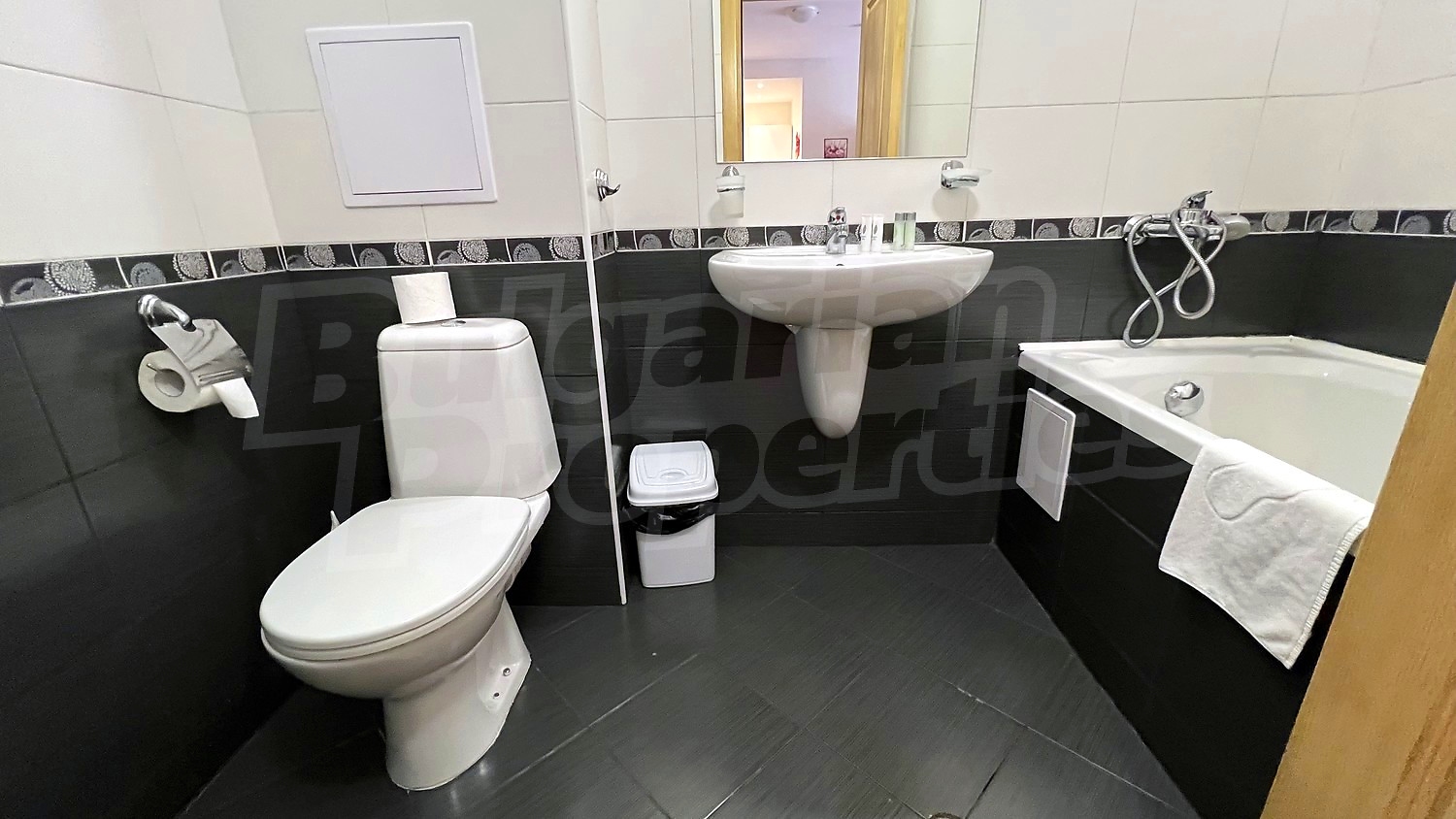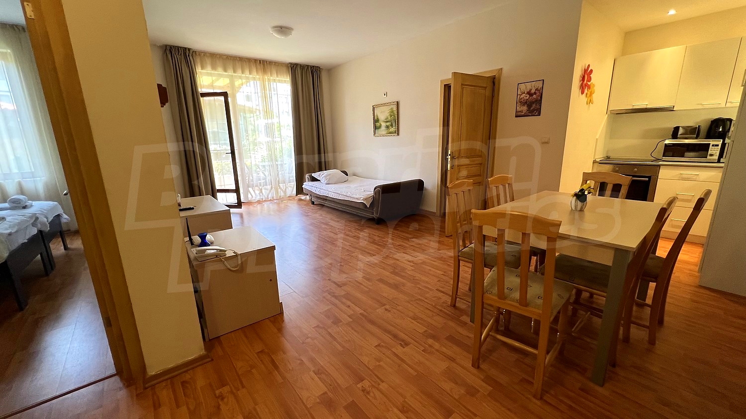 The comfortably furnished and equipped apartment includes a living room with a kitchenette, fully equipped with all necessary appliances and a table with chairs for dining, sofas and TV, air conditioning, 2 bedrooms, 2 bathrooms with WC and a bathtub and a balcony with a beautiful view to the courtyard of complex with swimming pool.