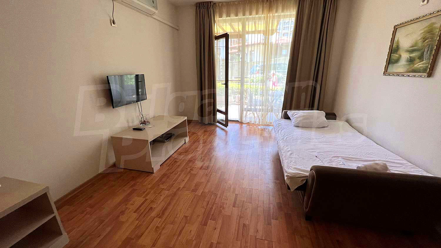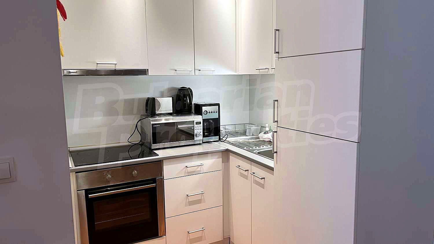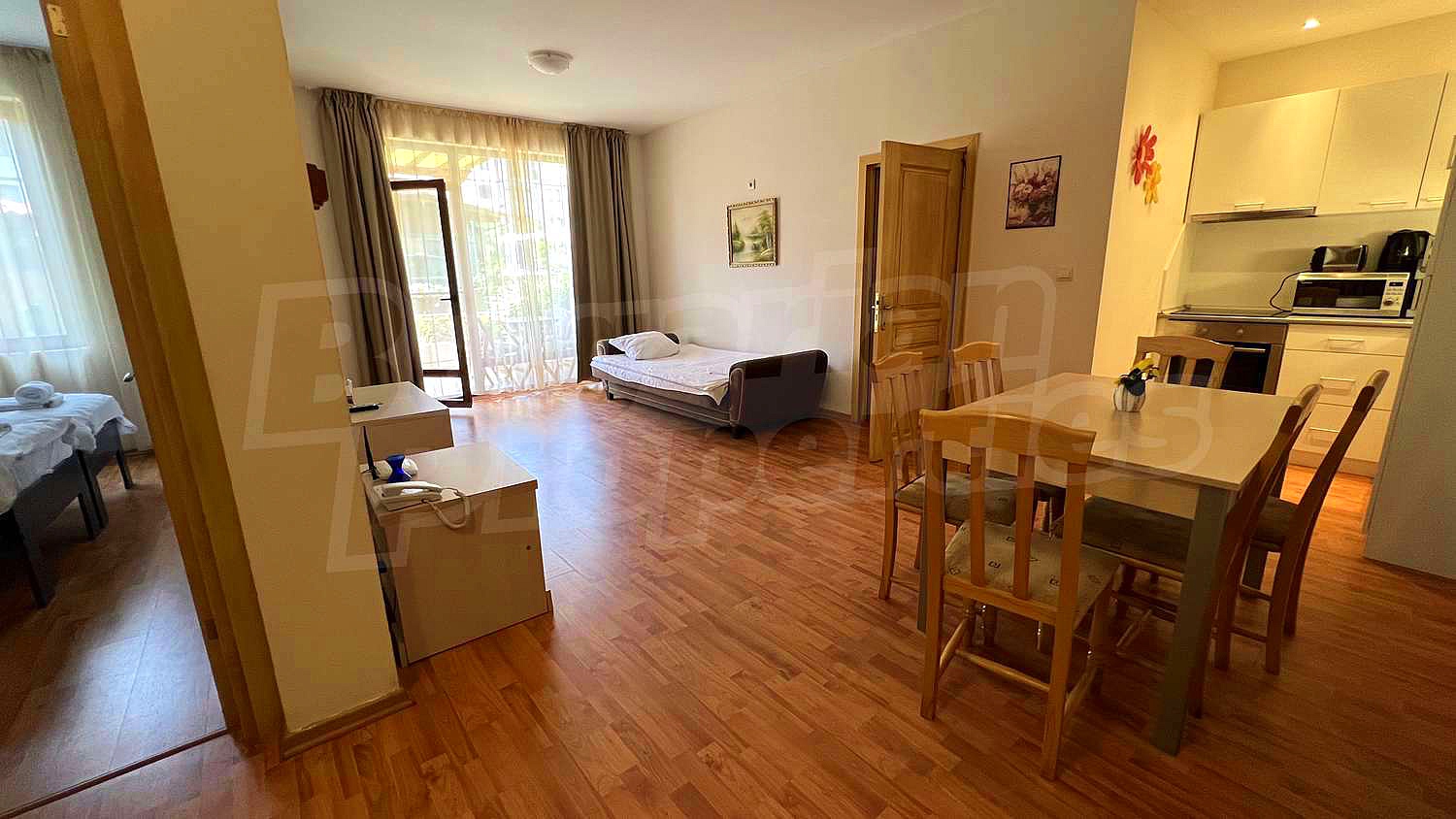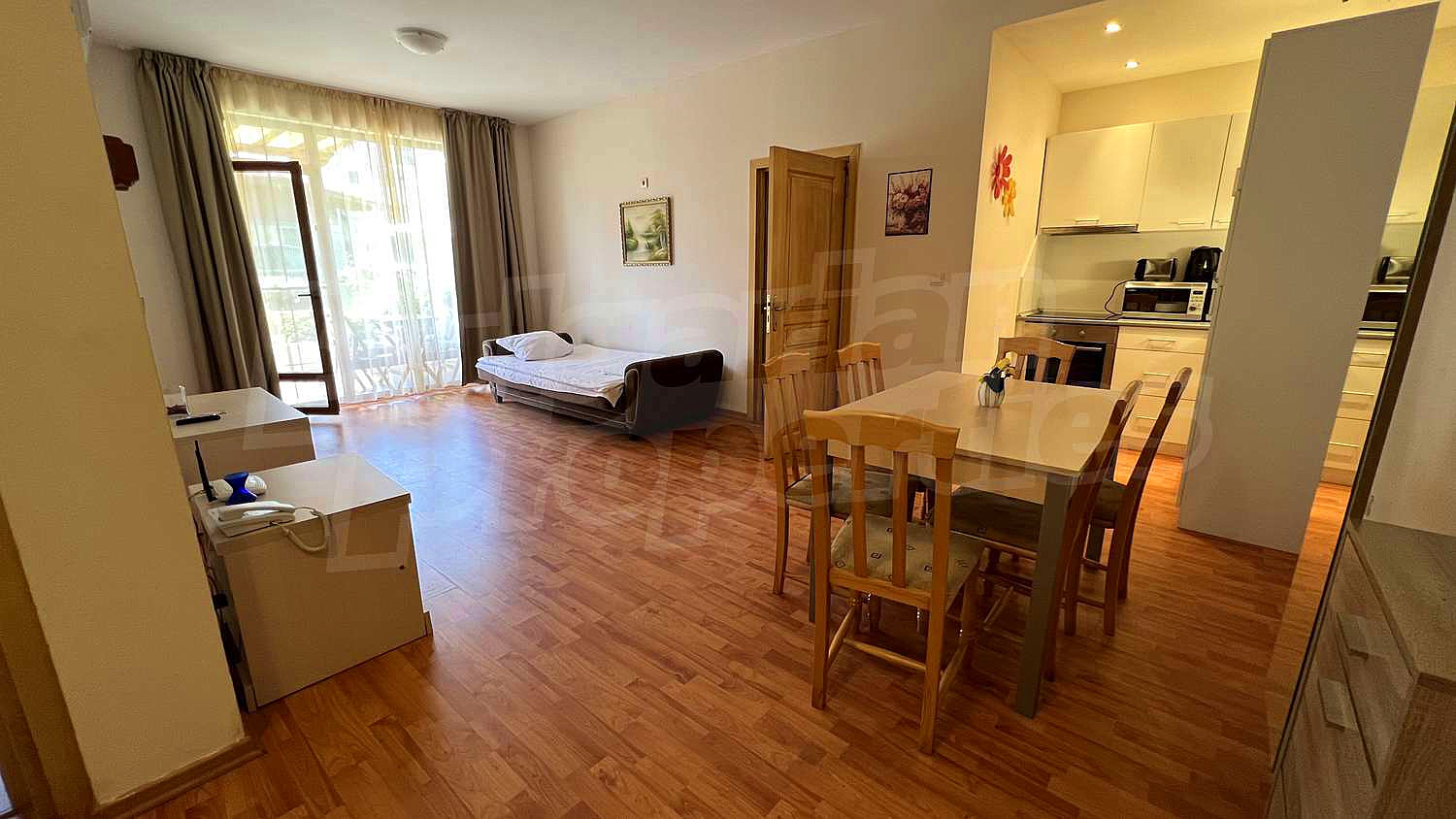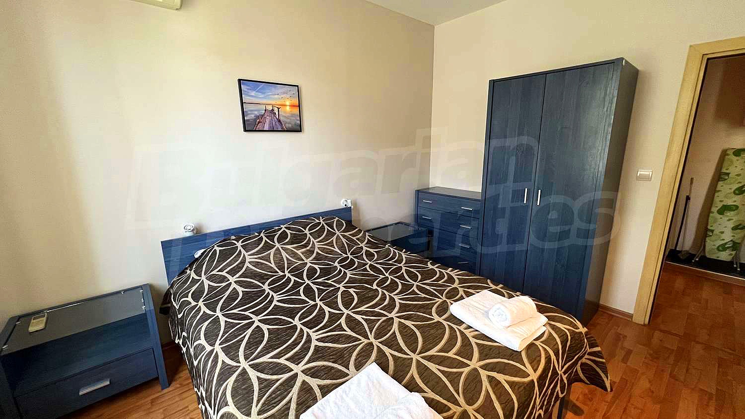 The comfortably furnished and equipped apartment includes a living room with a kitchenette, fully equipped with all necessary appliances and a table with chairs for dining, sofas and TV, air conditioning, 2 bedrooms, 2 bathrooms with WC and a bathtub and a balcony with a beautiful view to the courtyard of complex with swimming pool.