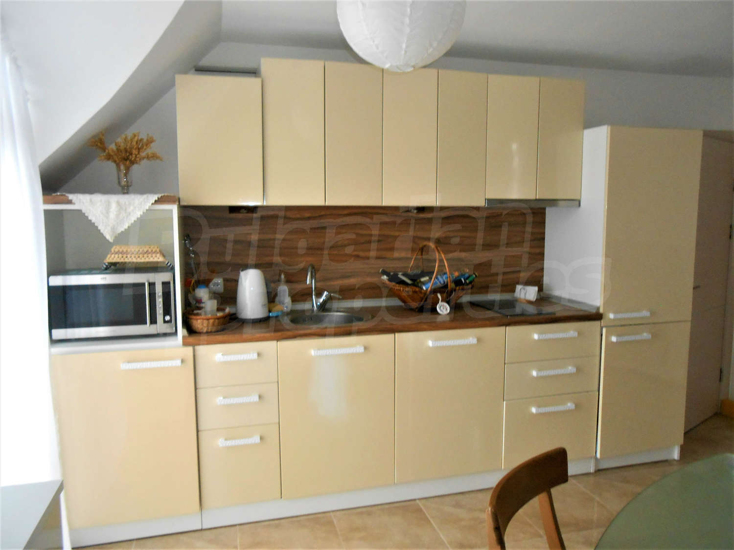 - Kitchen with sink, extractor hood, built-in hob, fridge - Electrolux, washing machine - Indesit, dishwasher - Bosch, microwave - AEG, utensils;