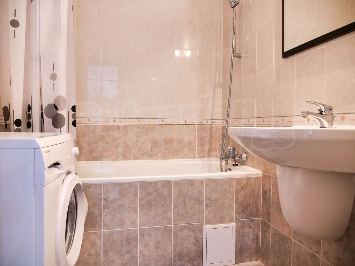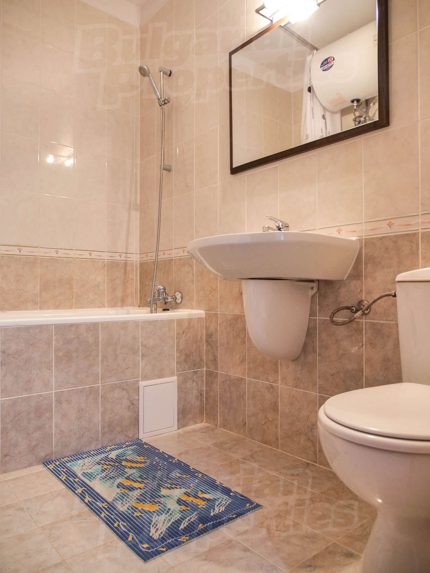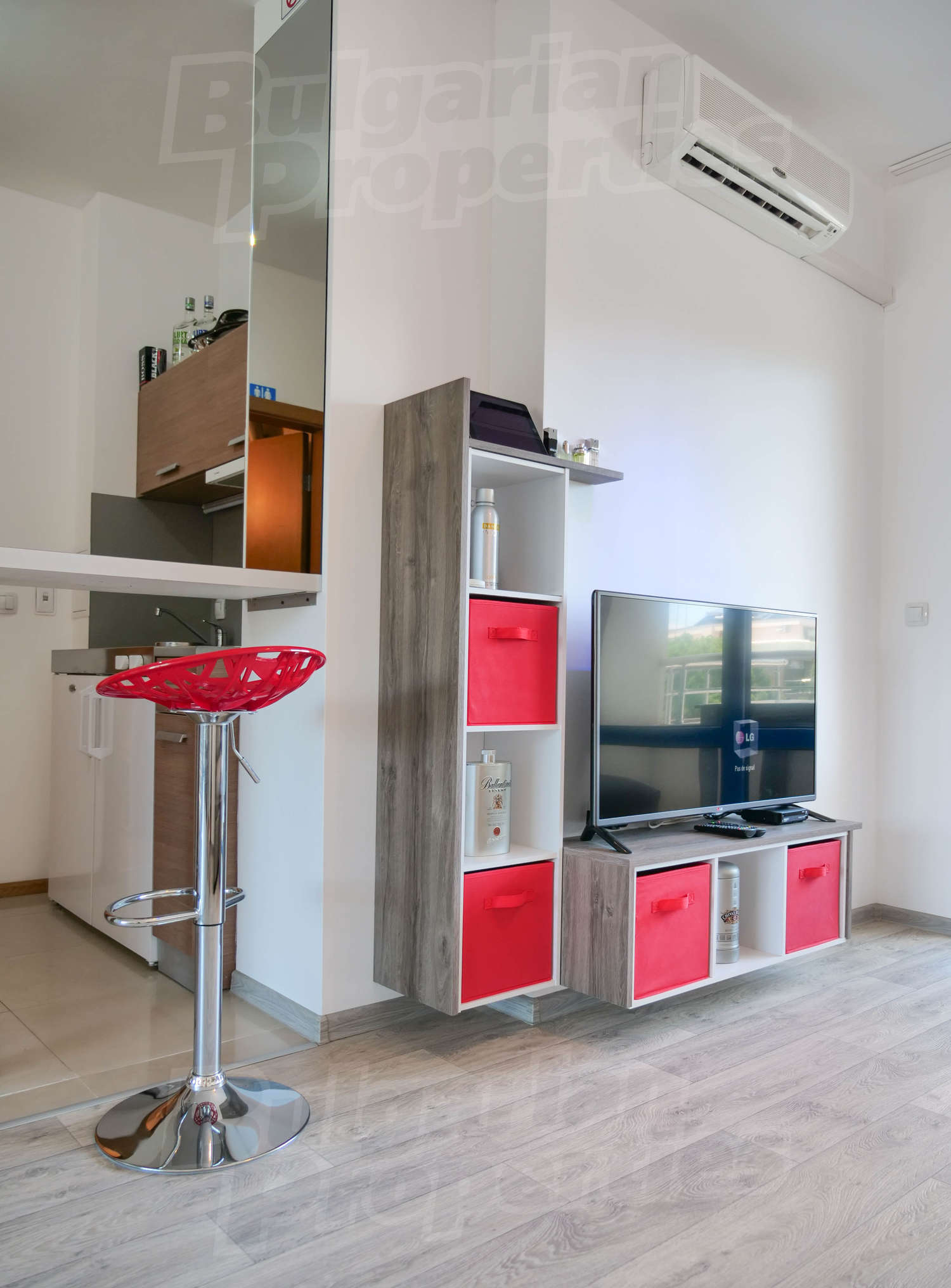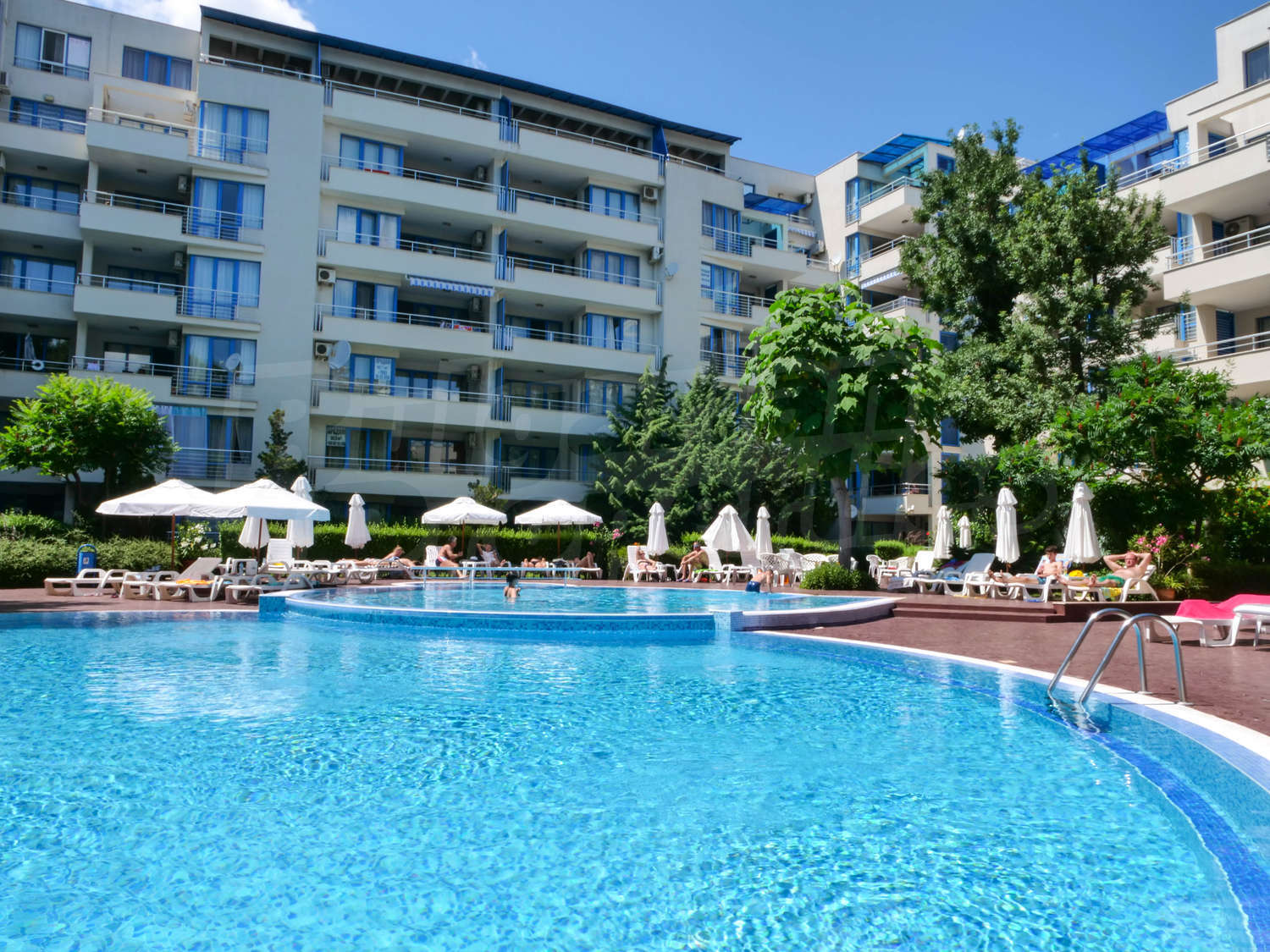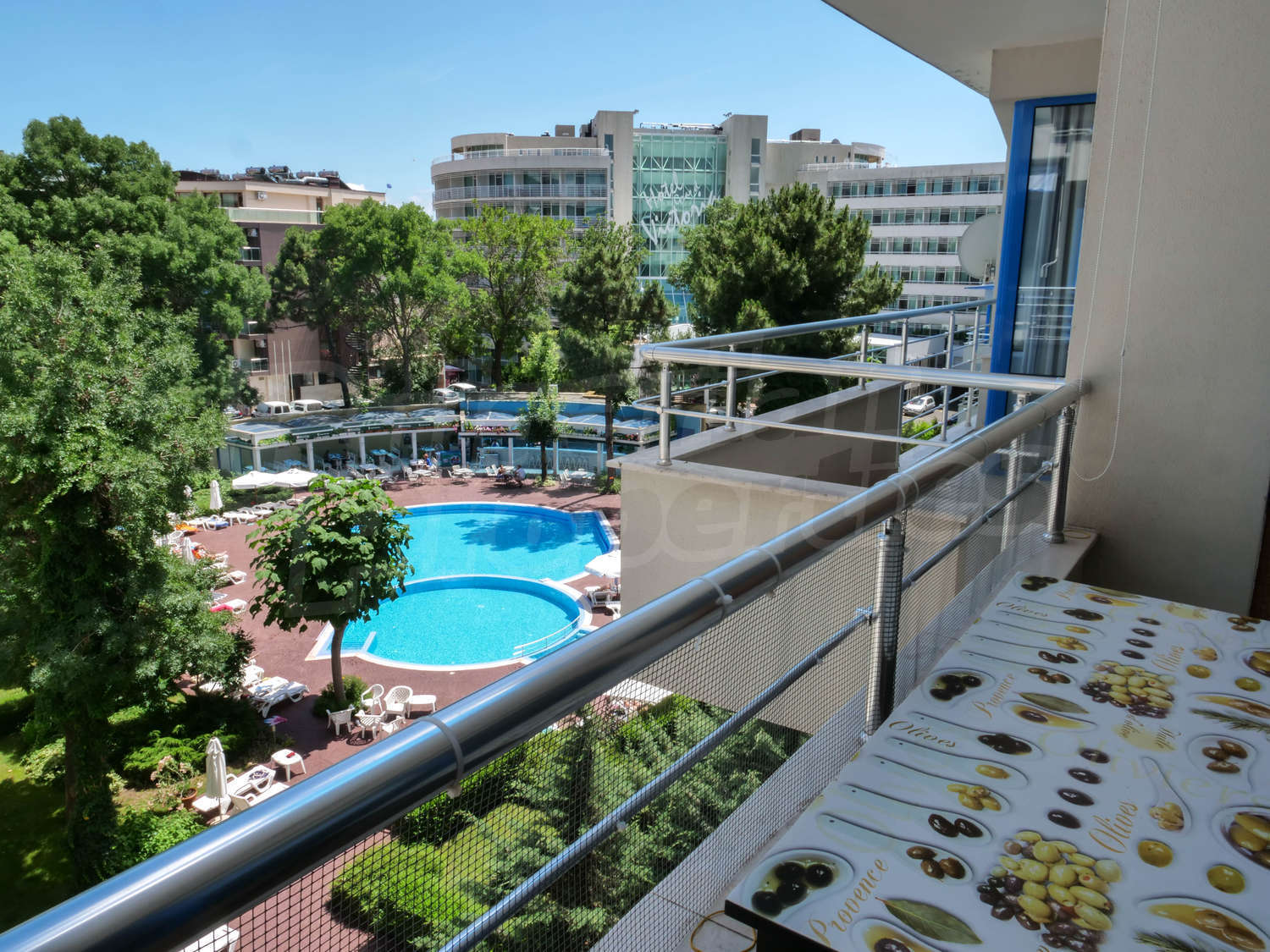 The modern gated complex consists of 100 apartments and has nice swimming pool (with areas for adults and children), pool bar, well-landscaped garden, reception (open during the summer season). On the ground floor there is a restaurant, food store and other shops. The architecture is modern and the materials used in the construction and finishing works are of high class. The common areas are aesthetically finished, the elevator is inox, with automatic doors. The inner garden and swimming pool area are beautifully landscaped and the lanes are well-formed with stamped and painted concrete. The maintenance of the building, common areas, garden and swimming pool is done by professional team working here year round.