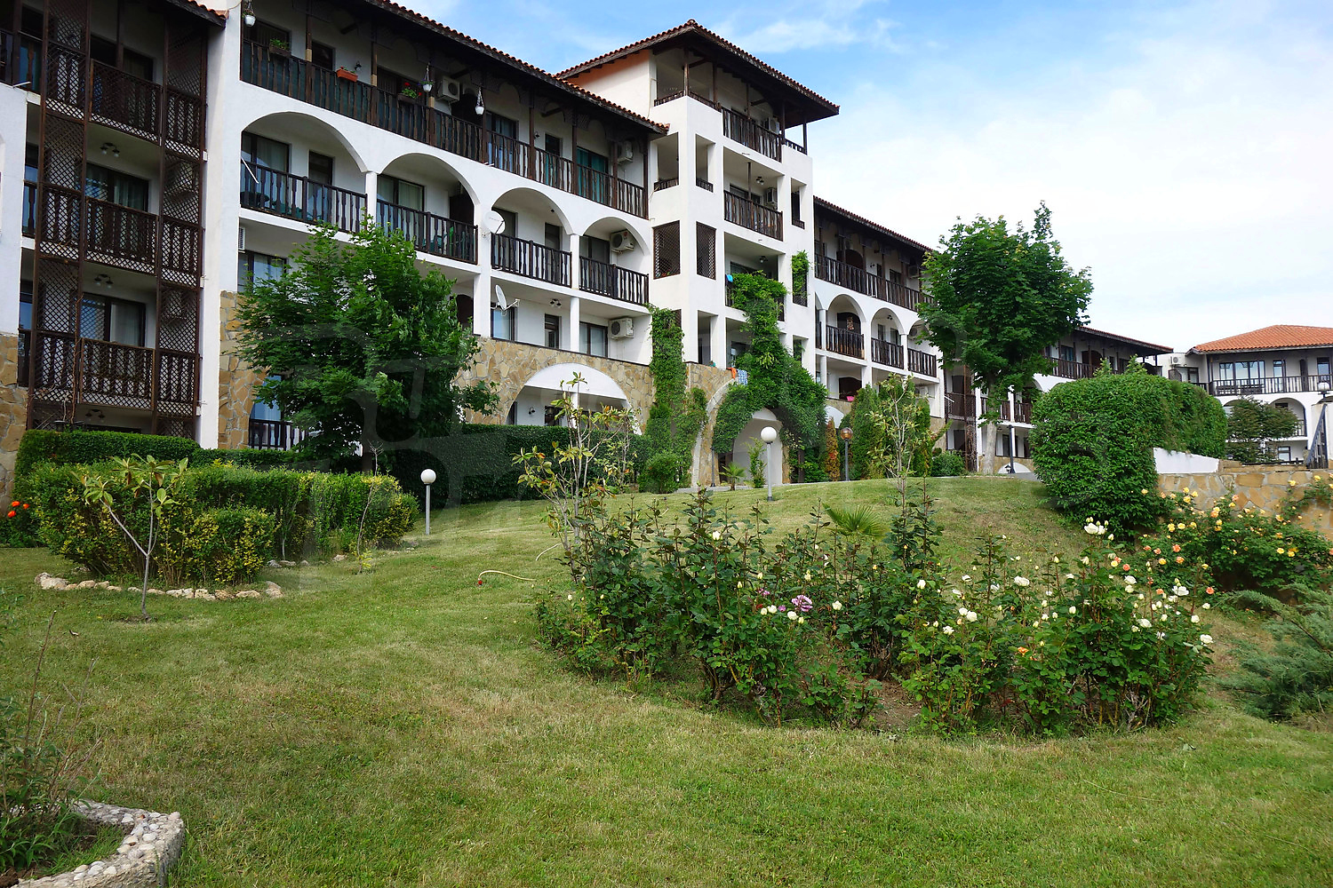 We offer for sale a spacious two-bedroom apartment in year-round complex Vodenitsata/Watermill, very close to the Marina Dinevi port and the beach in the resort of Sveti Vlas. The Vodenitsata complex is entirely designed in a traditional Bulgarian style. It is about 400 m from the beach and 150 m from the spa.