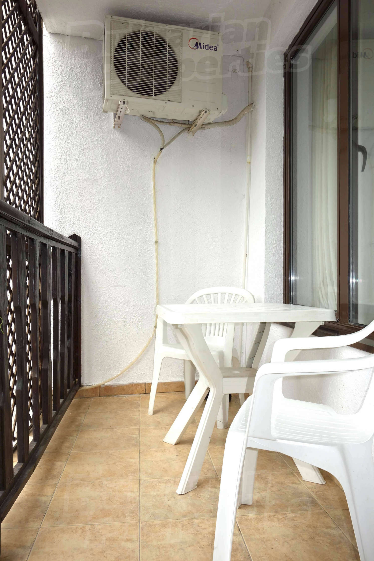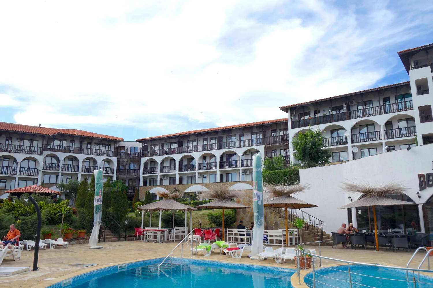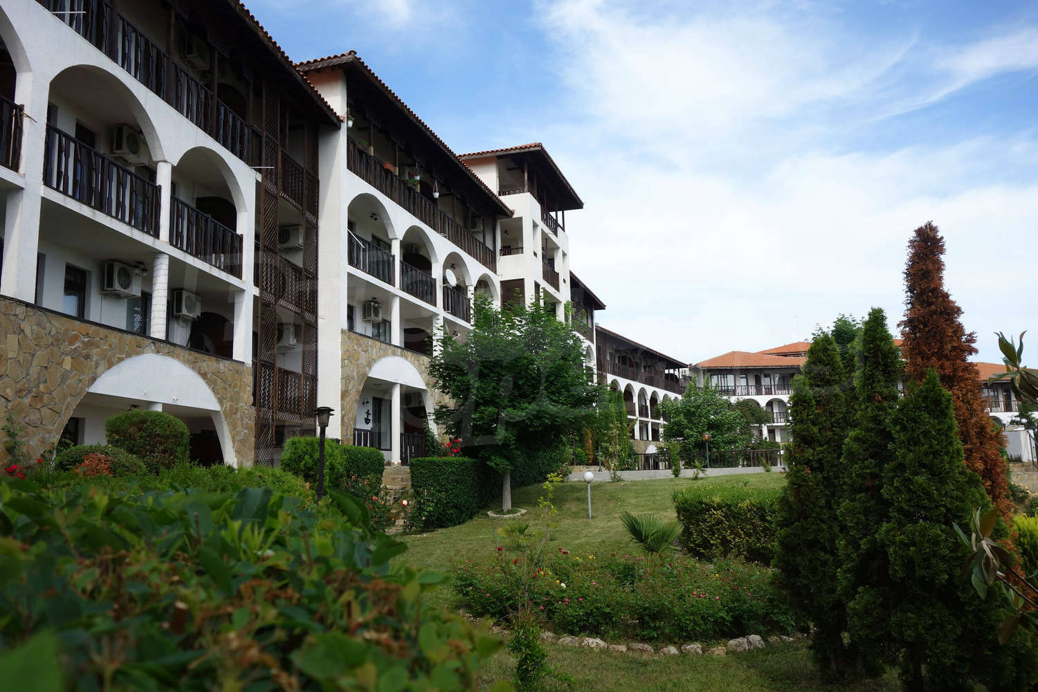 • one balcony overlooking the courtyard of the complex and the seas.