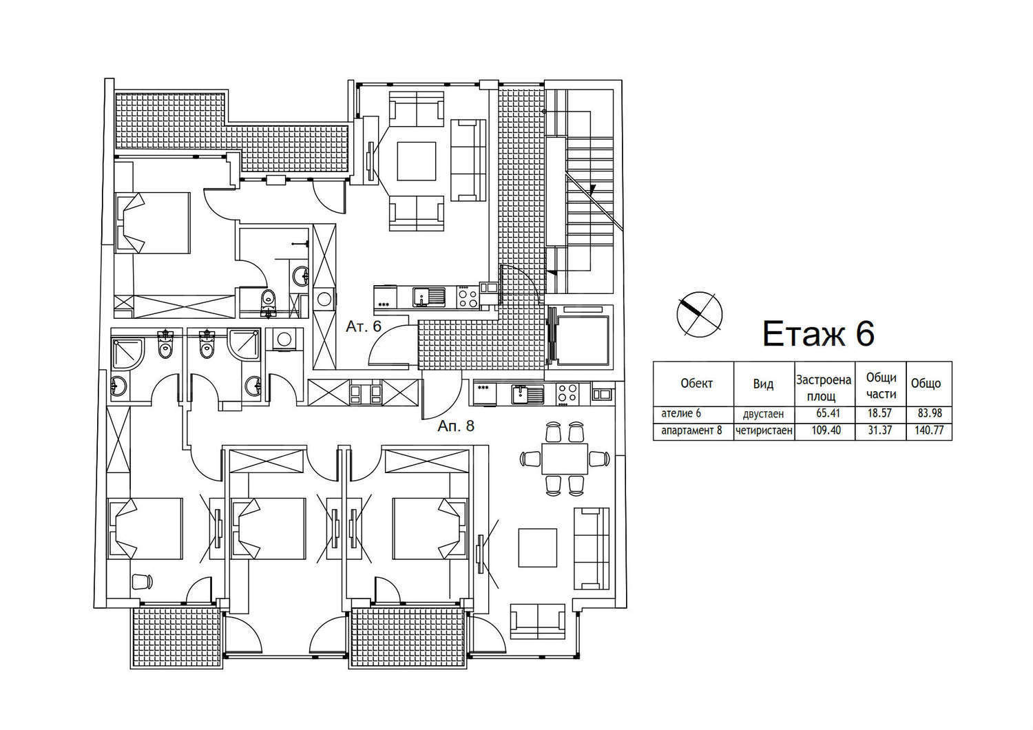 140.77 m2 (net area: 109.4 m2 plus common parts: 31.37 m2)