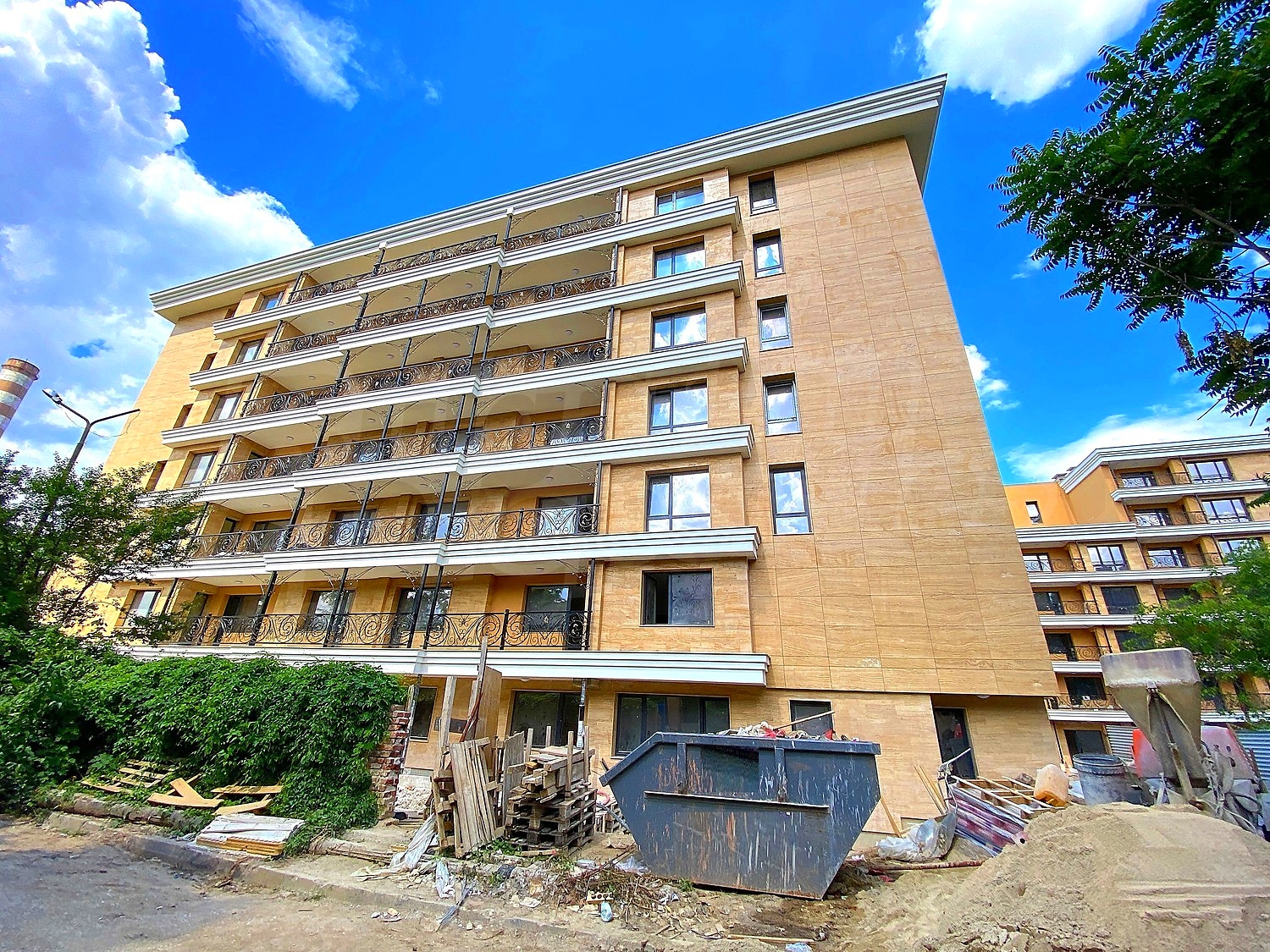 Two buildings will be built: one is T-shaped, located in the north-west part of the property with entrances "A" and "B" and the other one is centrally located in the property with entrances "B" and "D". On the north-eastern border of the property is a one-storey building with 7 studios.