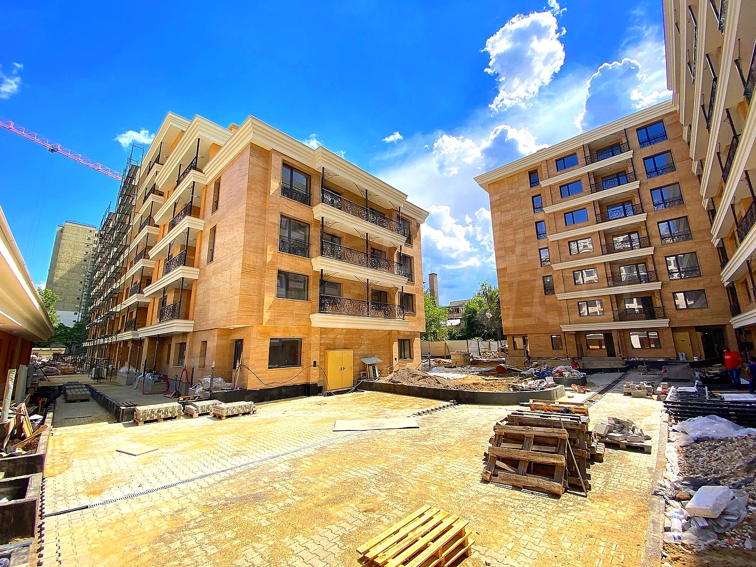 Two buildings will be built: one is T-shaped, located in the north-west part of the property with entrances "A" and "B" and the other one is centrally located in the property with entrances "B" and "D". On the north-eastern border of the property is a one-storey building with 7 studios.