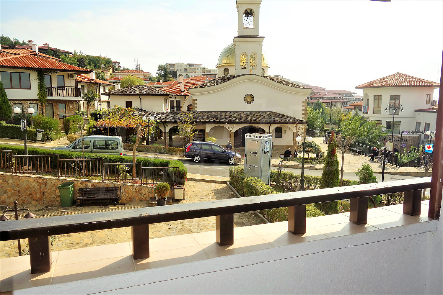 balcony with sea, church and pool views