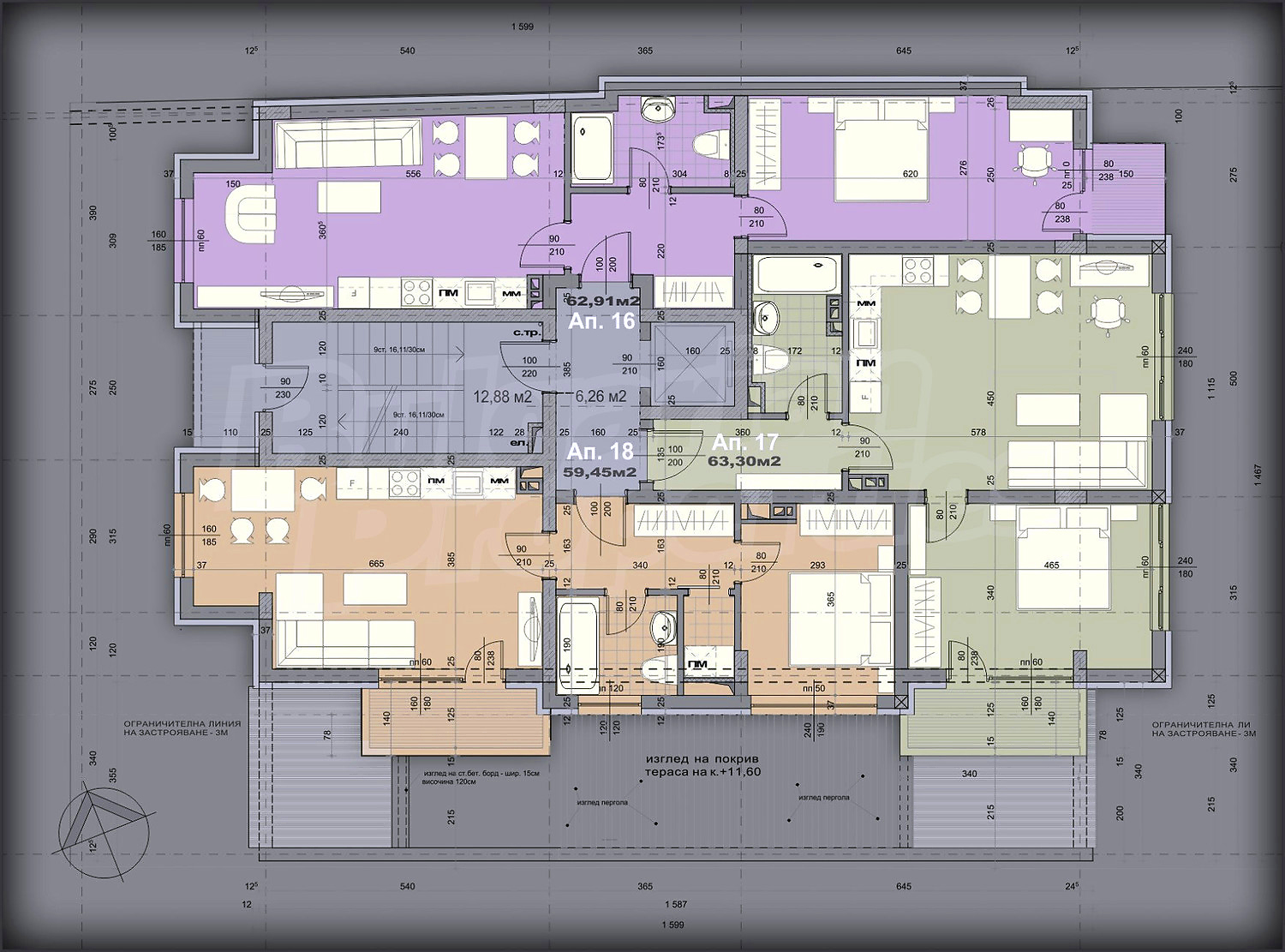 Area with regular public transport to the central part of the capital, next to one of the main streets of the city. The project includes 25 apartments, warehouses, underground and ground parking lots and garages.