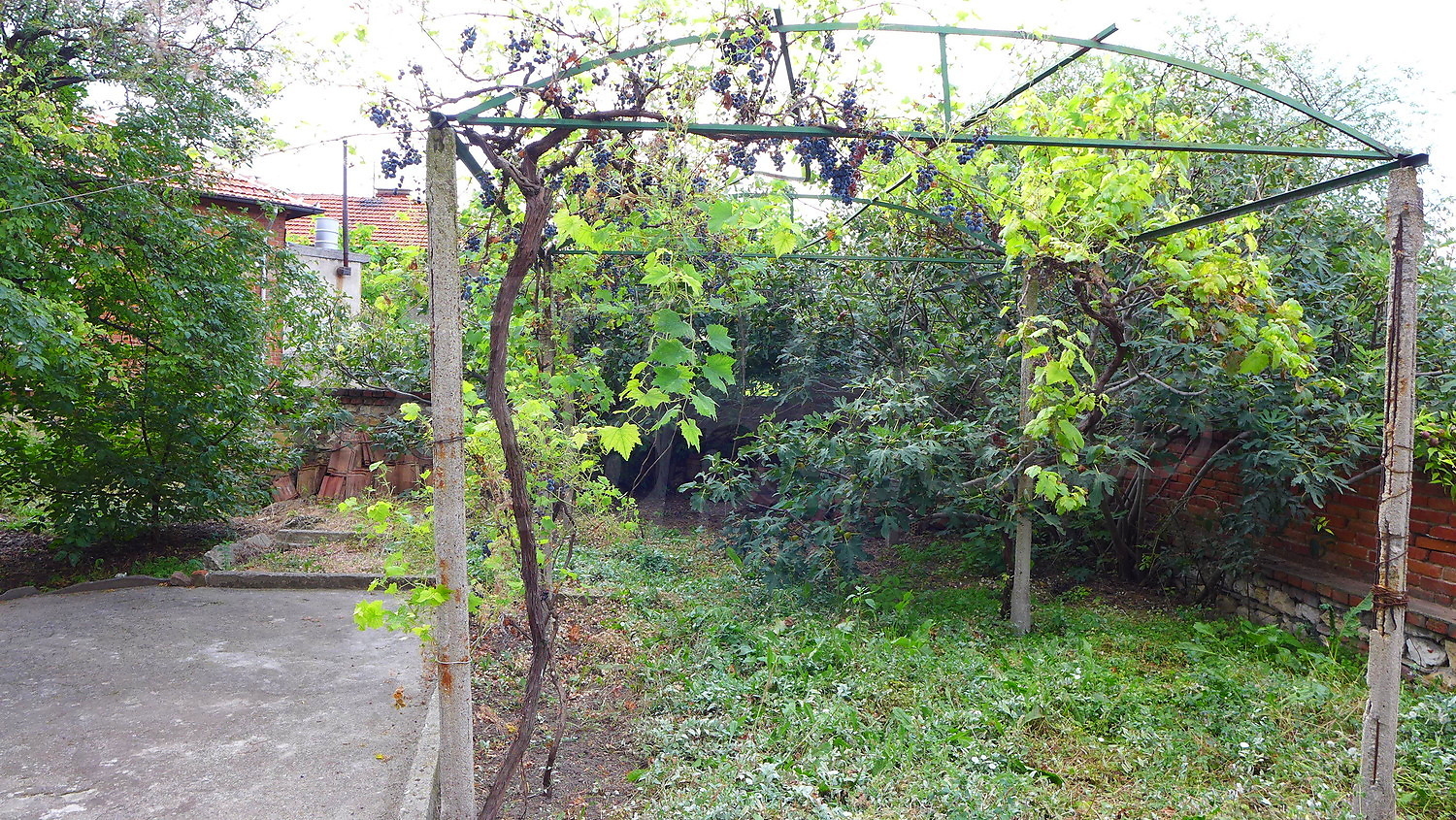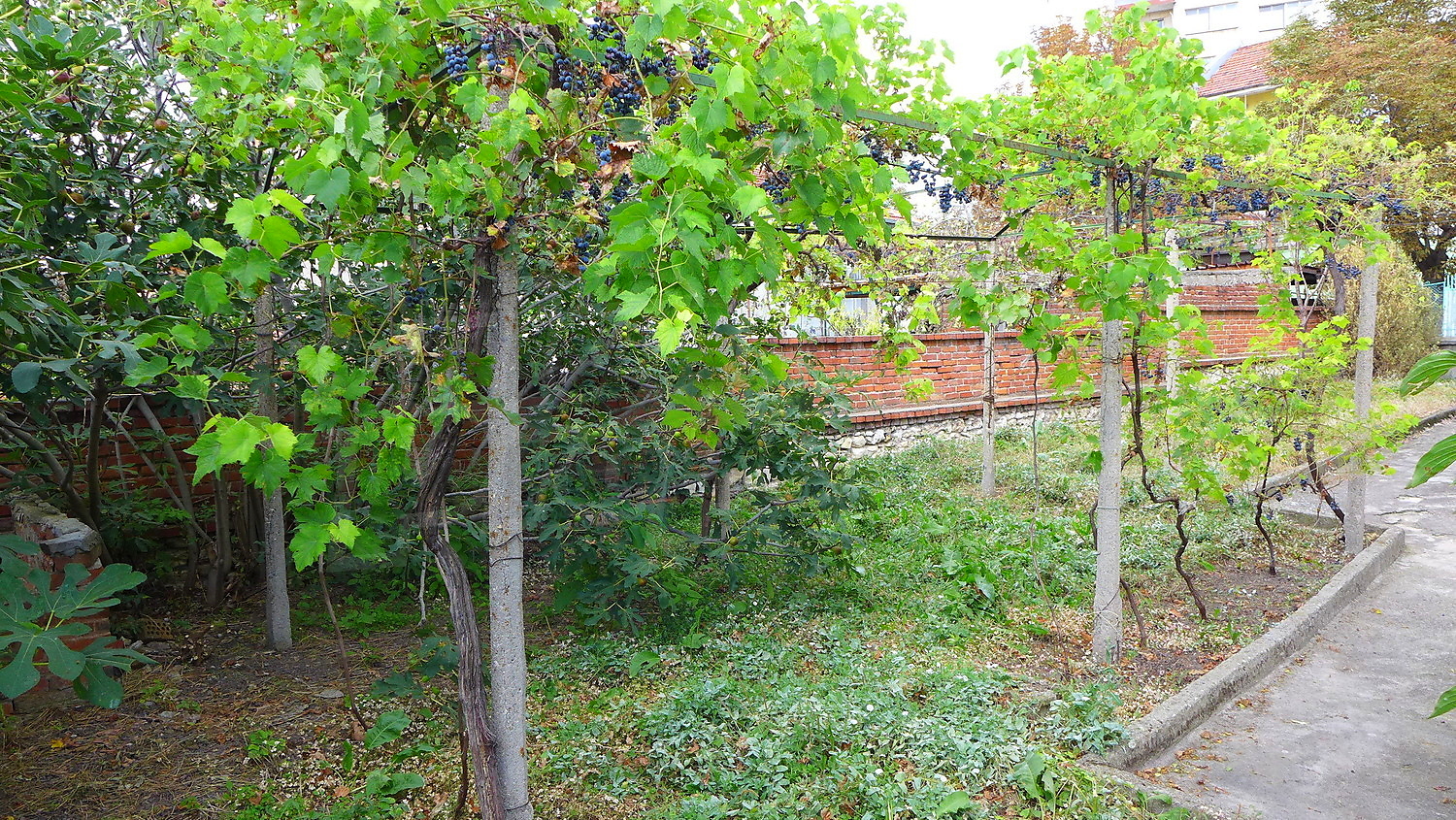 The garden is planted with trellis vine and flowers.