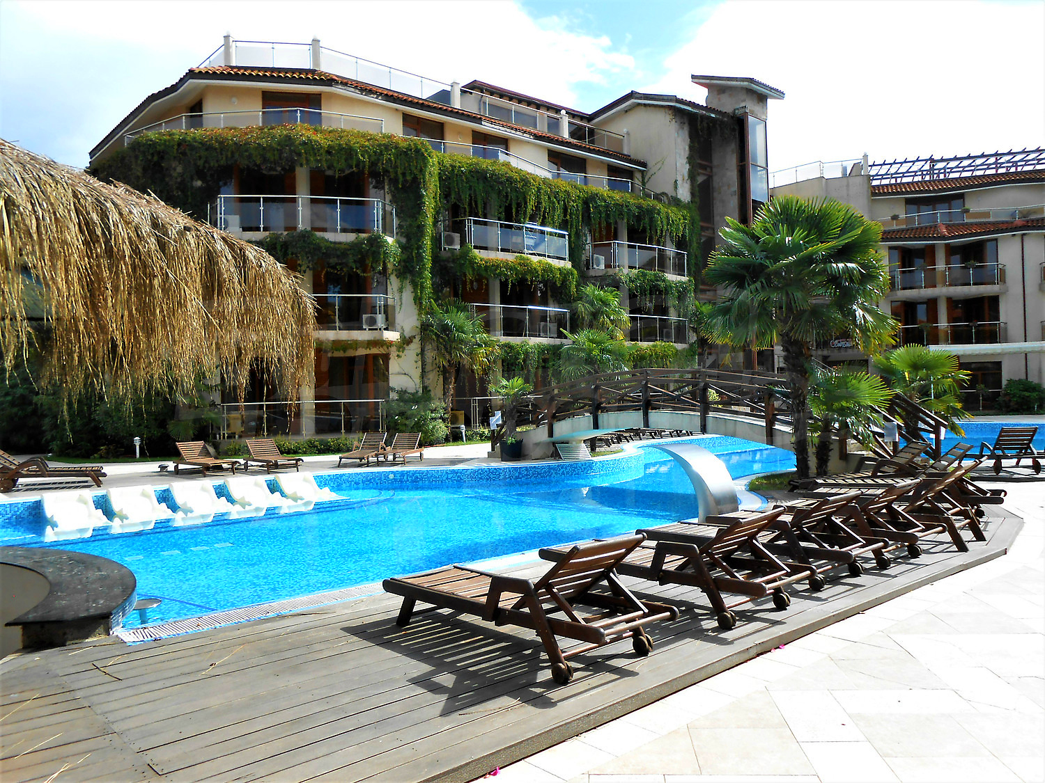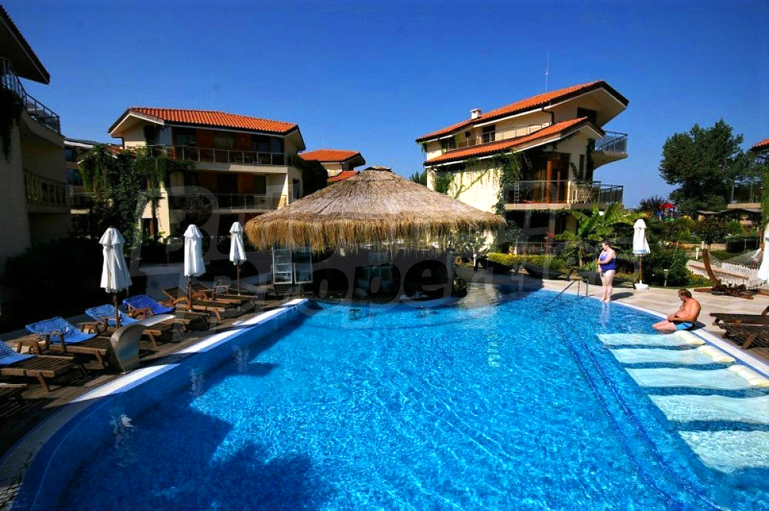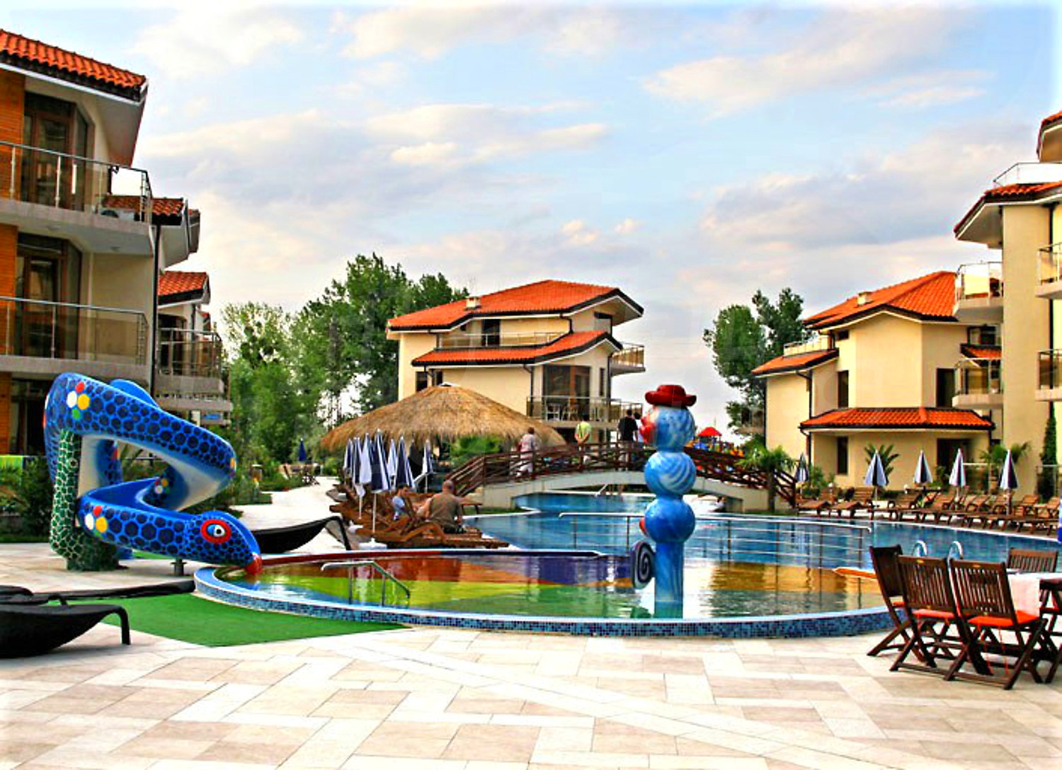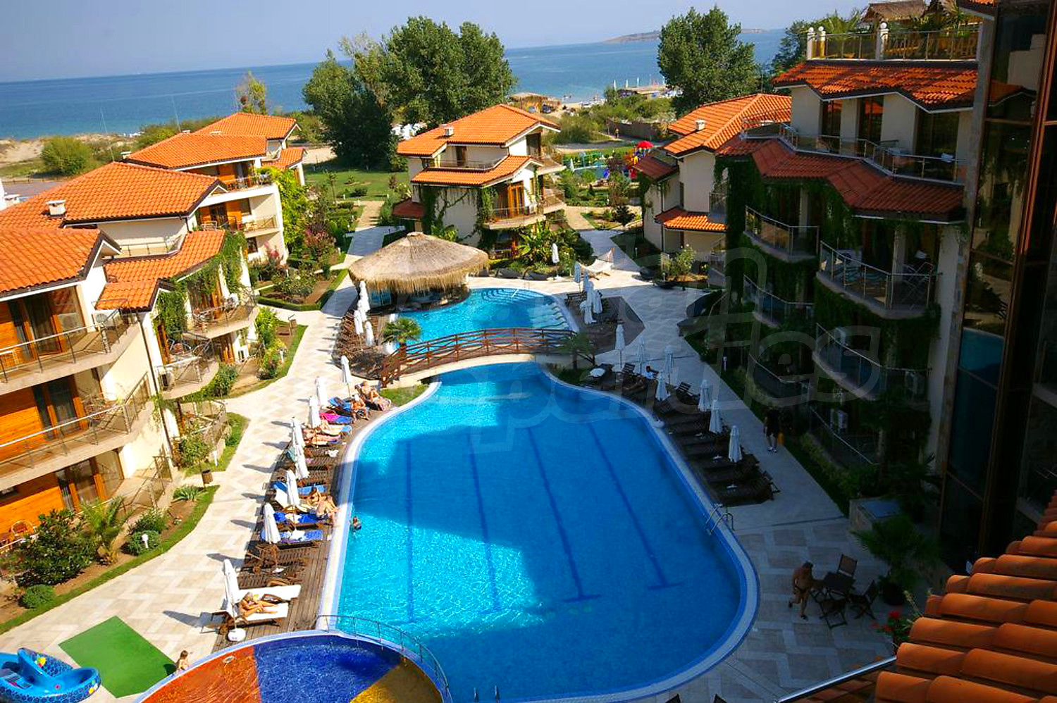 Laguna Beach complex has free parking lot and offers panoramic views of the Black Sea coast, as well as a variety of opportunities for recreation and entertainment - outdoor swimming pool with children's pool, beautiful gardens, children playground, fitness center, sauna, steam bath, Turkish bath, table tennis, tennis court, billiards, football on small doors, car and bicycle rental, SPA center (400 sq.m.) with beauty salon, medical services, massages, jacuzzi.