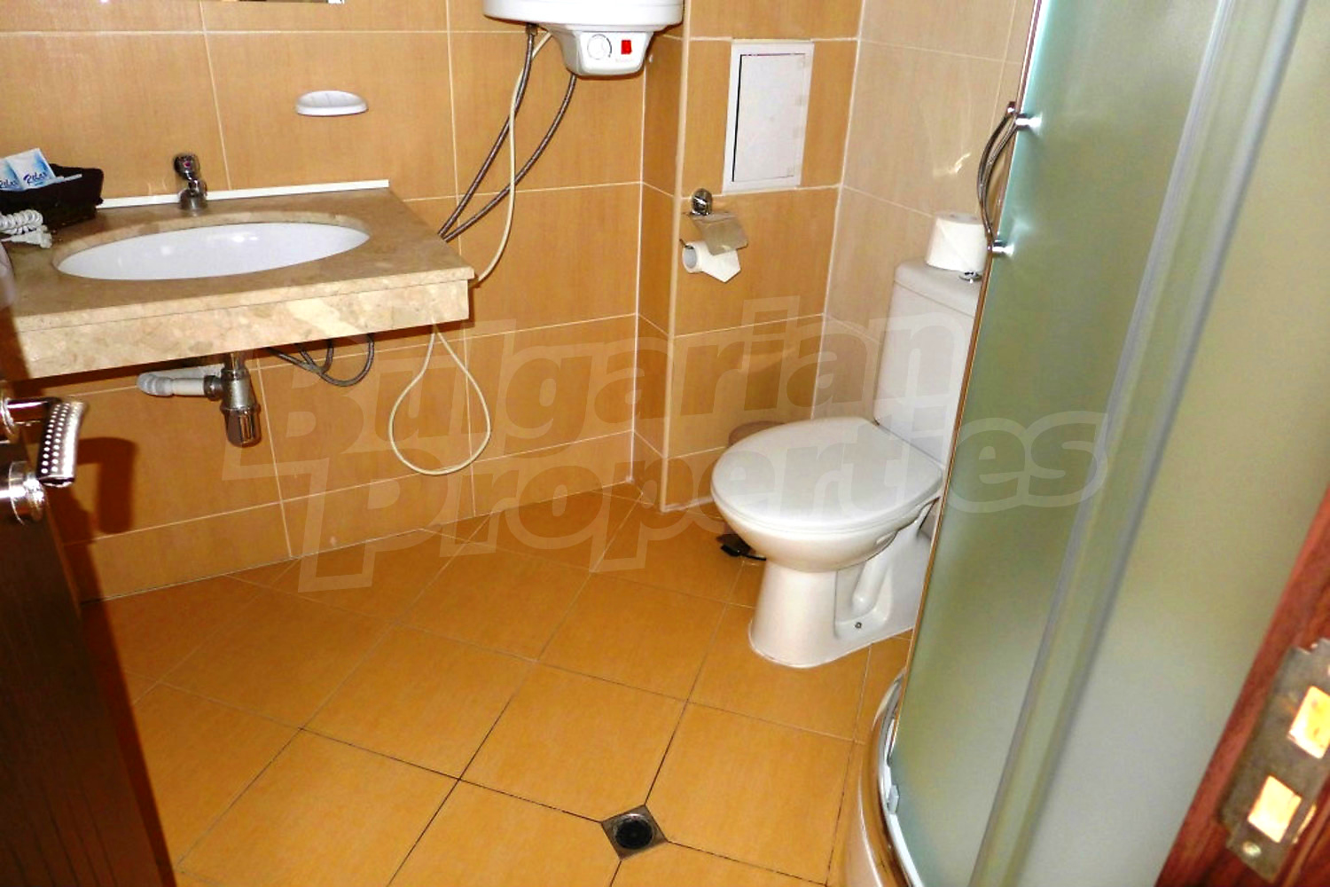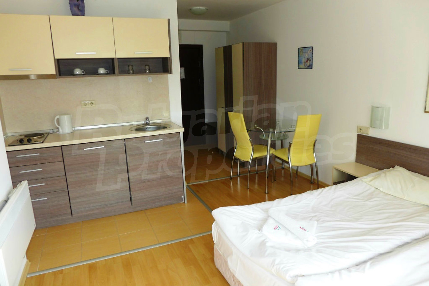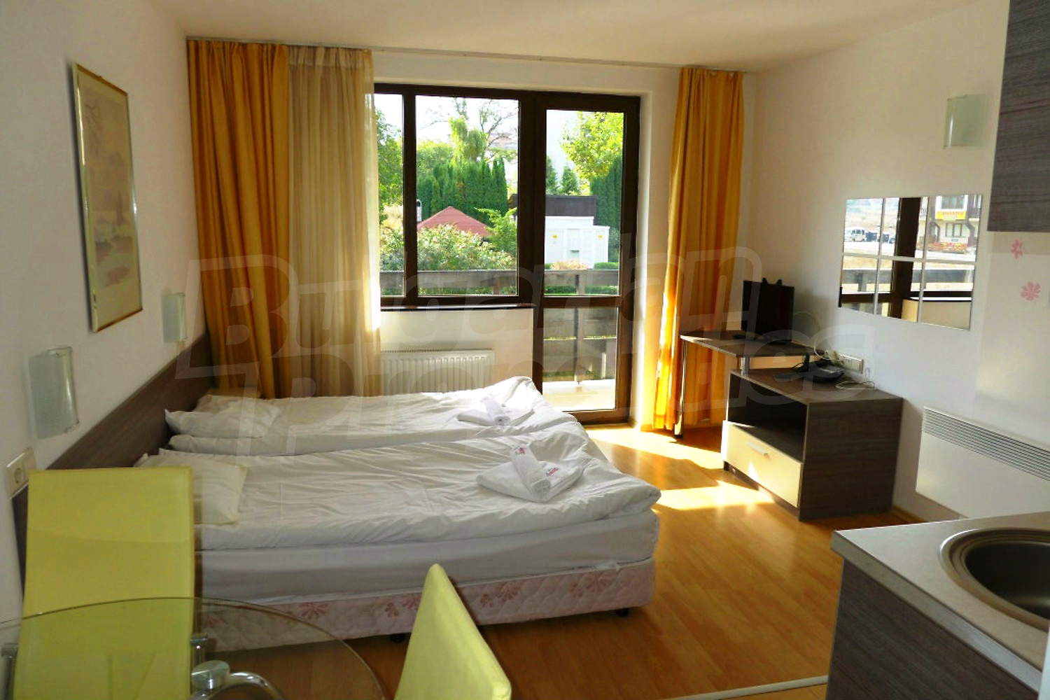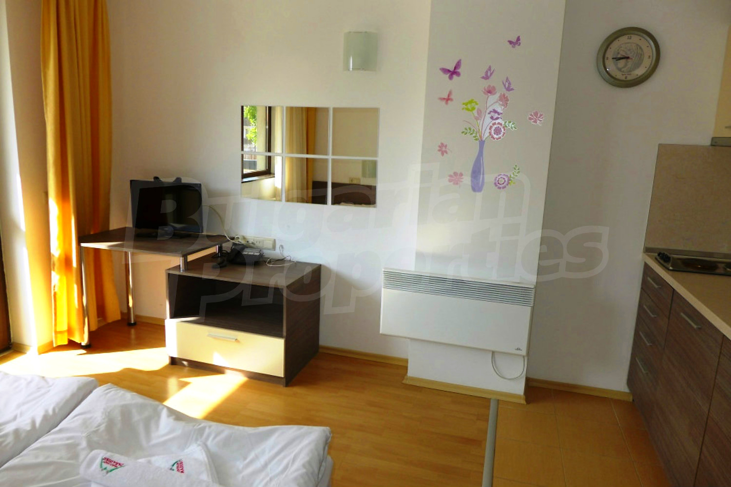 The south-facing studio is set on the first floor with a total area of 39.16 sq.m., net area - 32.2 sq.m. It consists of a living room with kitchenette, dining nd sleeping areas (2 twin beds, TV set, dining table with chairs, blinds), balcony, bathroom with shower box and toilet. The property is offered for sale fully furnished with built-in kitchen, furniture and more. It is equipped with telephone, cable TV, internet. The small hotel equipment like TV, kettle and WC tools are not included in the price. Please advice with your estate agent for more information.