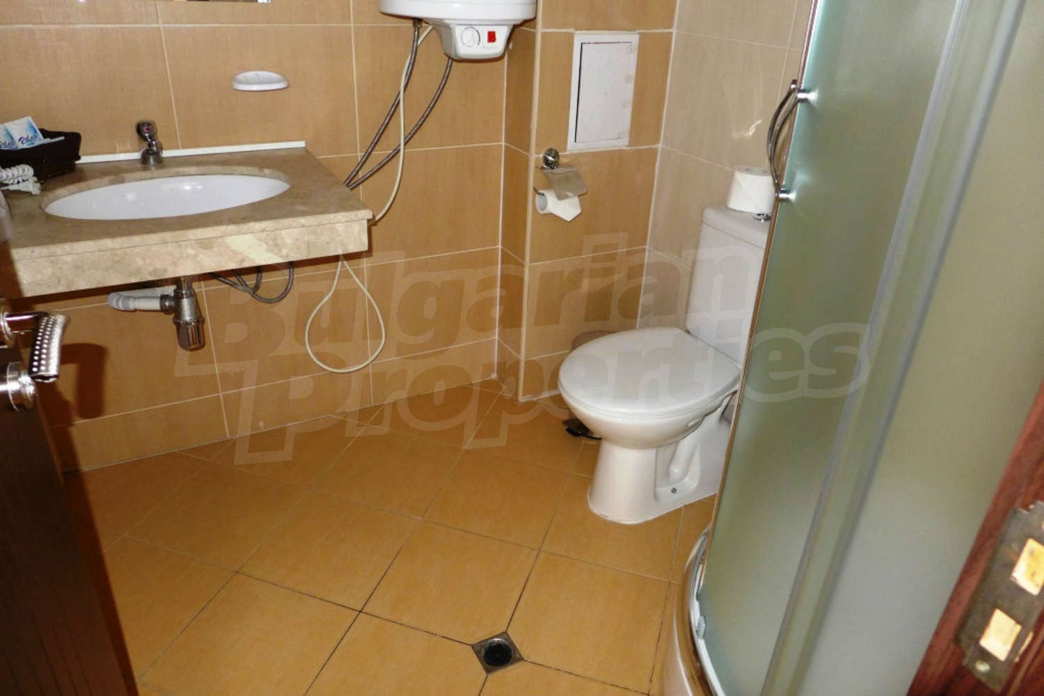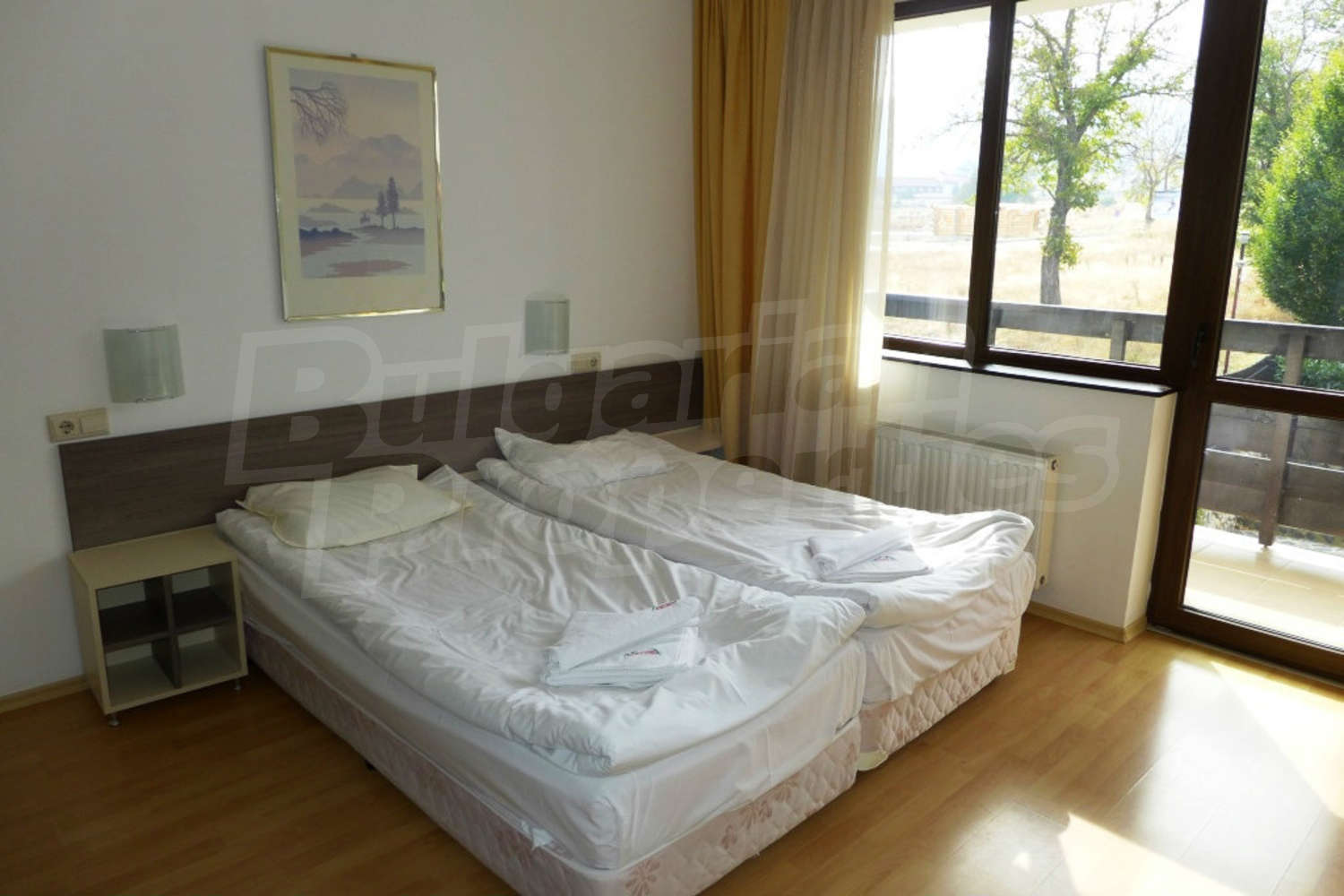 The south-facing studio is set on the first floor with a total area of 39.16 sq.m., net area - 32.2 sq.m. It consists of a living room with kitchenette, dining nd sleeping areas (2 twin beds, TV set, dining table with chairs, blinds), balcony, bathroom with shower box and toilet. The property is offered for sale fully furnished with built-in kitchen, furniture and more. It is equipped with telephone, cable TV, internet. The small hotel equipment like TV, kettle and WC tools are not included in the price. Please advice with your estate agent for more information.