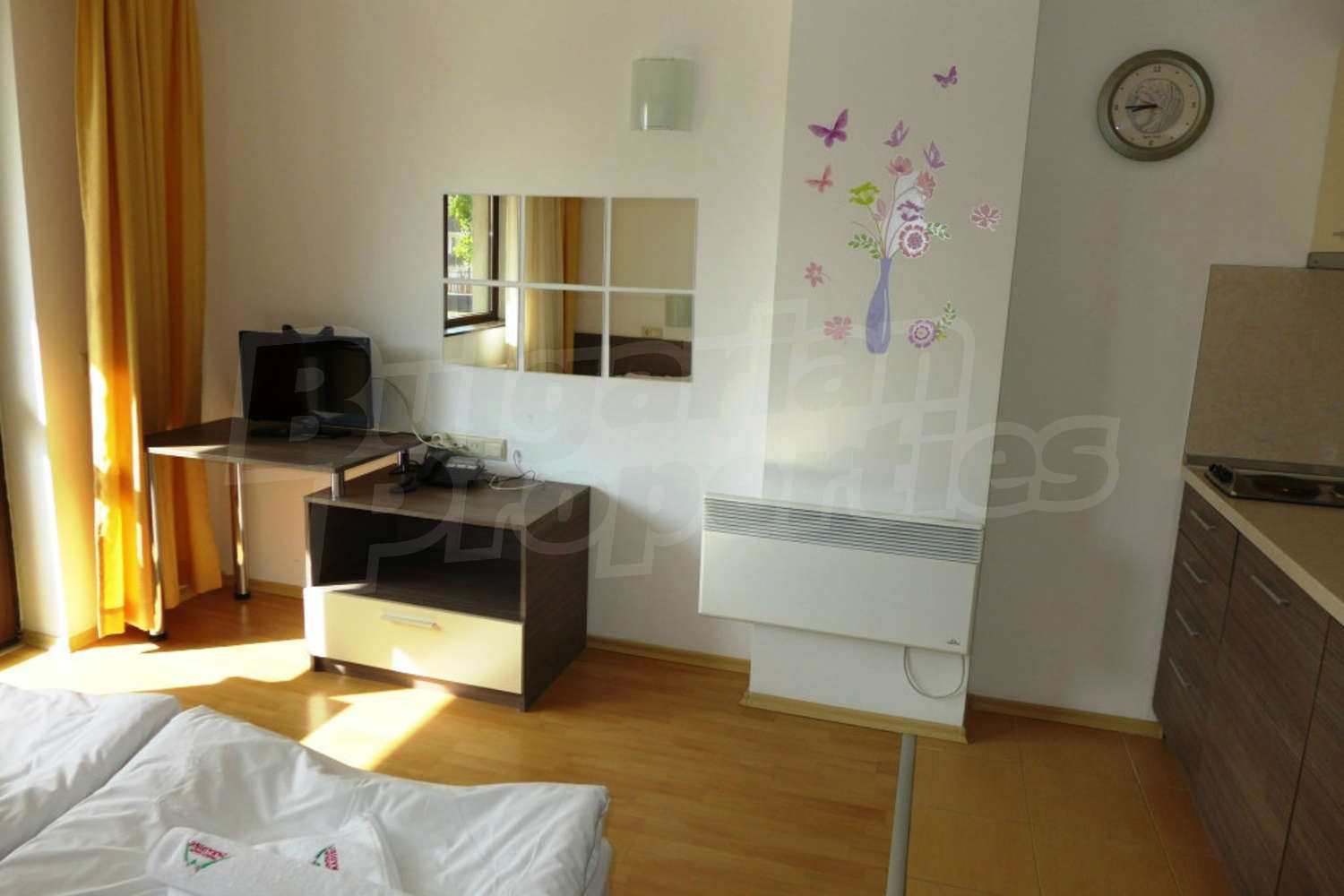 The south-facing studio is set on the first floor with a total area of 39.16 sq.m., net area - 32.2 sq.m. It consists of a living room with kitchenette, dining nd sleeping areas (2 twin beds, TV set, dining table with chairs, blinds), balcony, bathroom with shower box and toilet. The property is offered for sale fully furnished with built-in kitchen, furniture and more. It is equipped with telephone, cable TV, internet. The small hotel equipment like TV, kettle and WC tools are not included in the price. Please advice with your estate agent for more information.