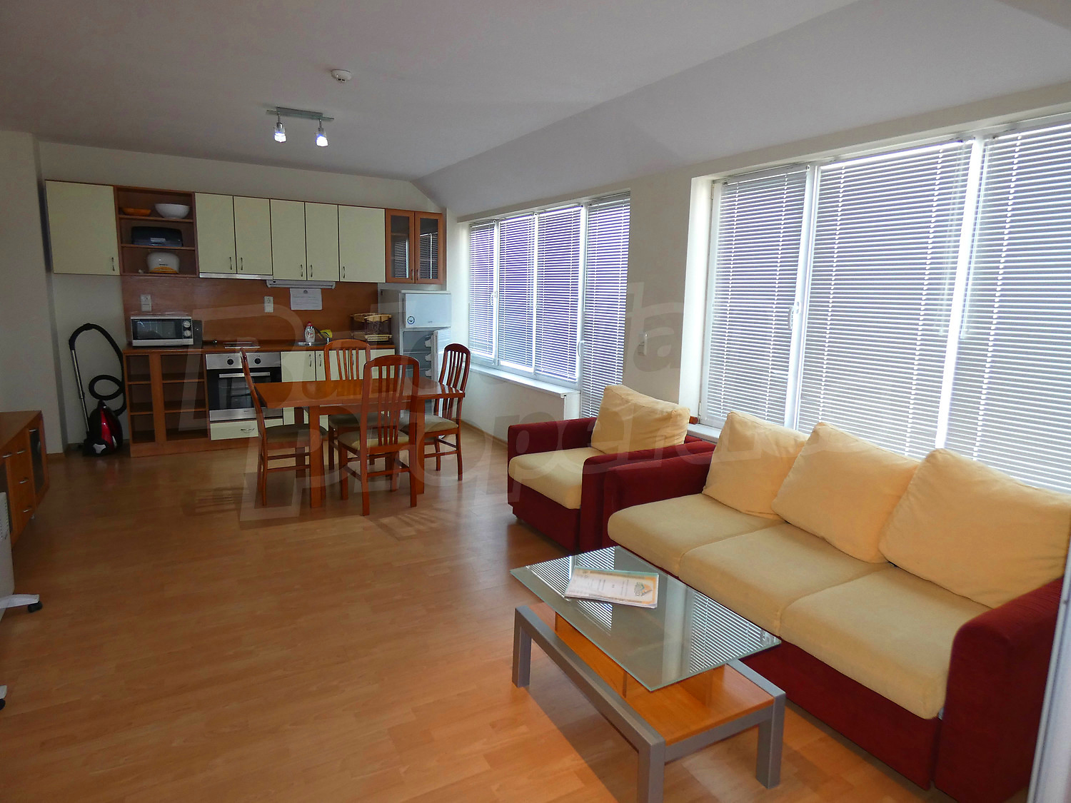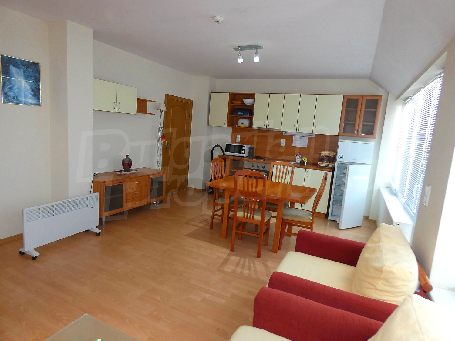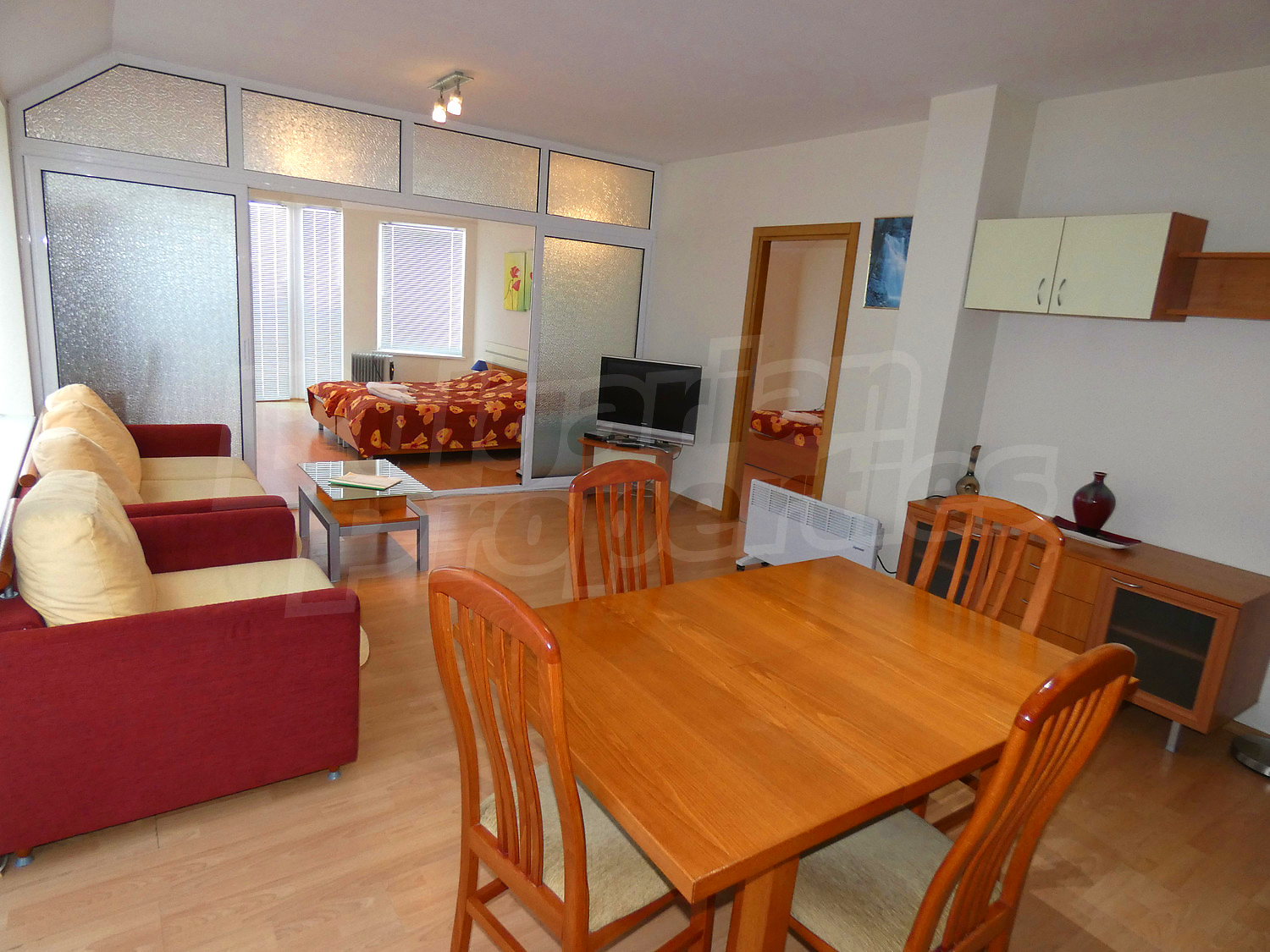 The apartment is set on the third floor in a building with a lift, with a total area of 100.89 sq.m., net area - 91.72 sq.m. It is heated by electrical convectors. The floorings are with laminate and the windows are PVC. The apartment is facing west / north and reveals picturesque views of Rila Mountain, forests and the village. The flat accommodates comfotably up to 6 adults or family with children. There are 2 bathrooms - one with a bathtub, the other with a shower. The living room is furnished with a sofa bed, dinning-table and fully equipped kitchenette (oven, electric hobs, microwave, fridge, toaster and kettle). Two separate bedrooms - one with a double bed and wardrobe, the other - with two single beds and wardrobe. This apartment is also equipped with a ski locker. The maintenance fee is 12 € per m2.