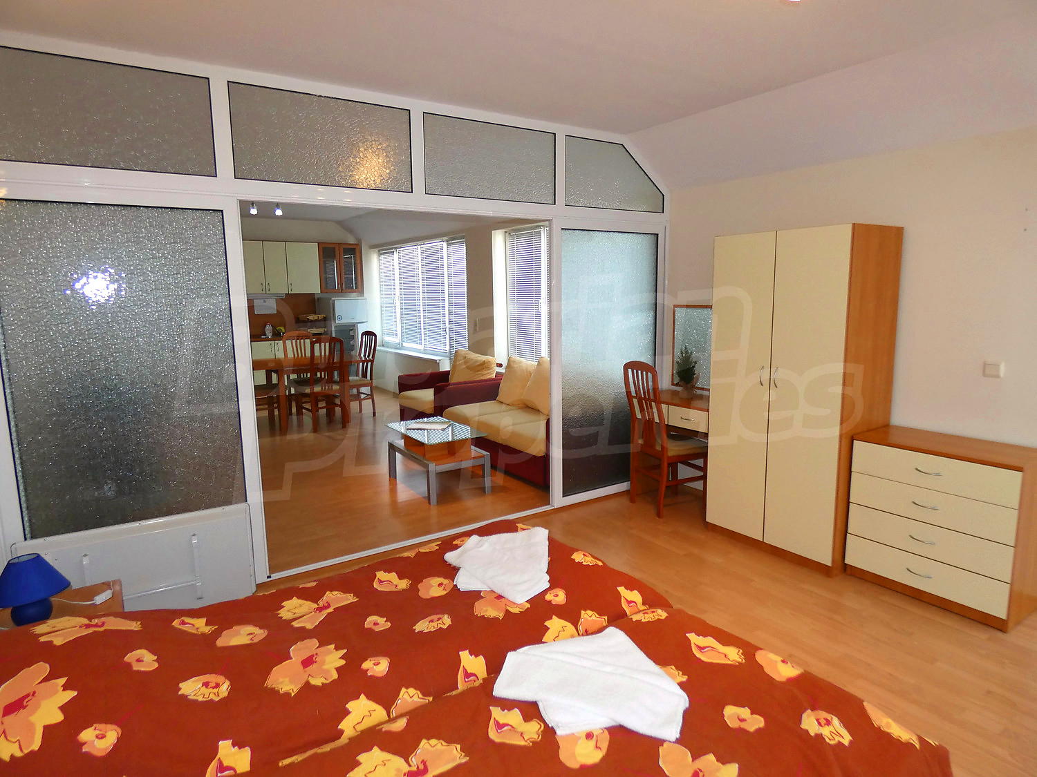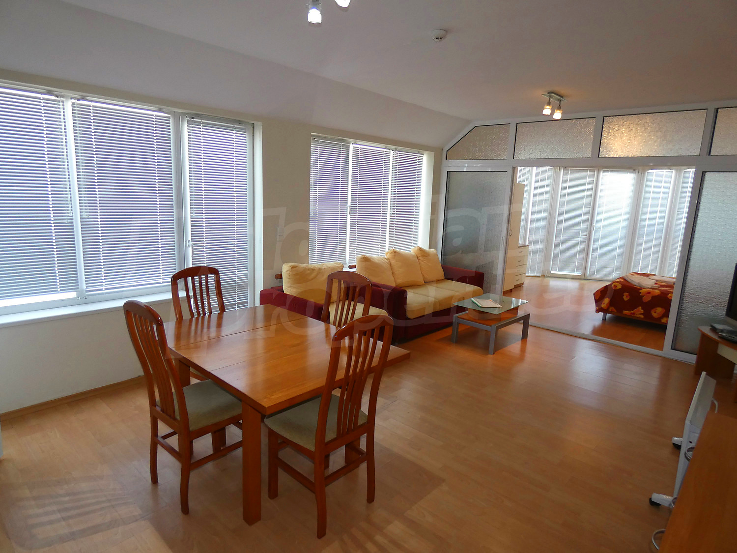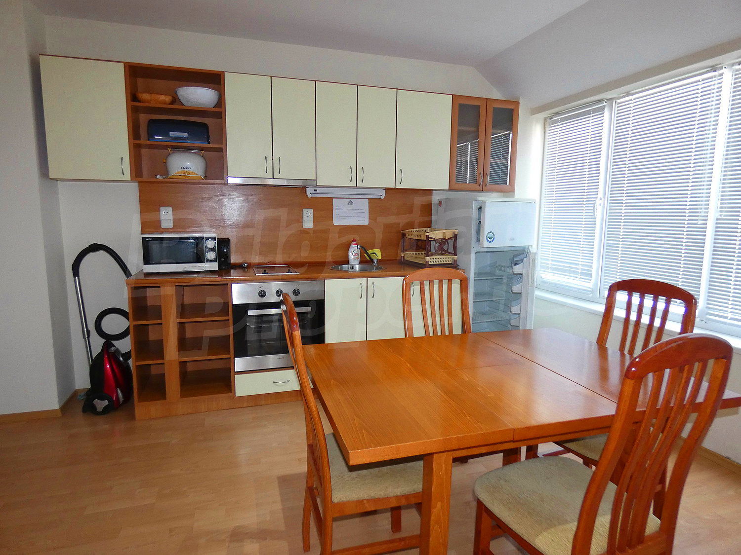 The apartment is set on the third floor in a building with a lift, with a total area of 100.89 sq.m., net area - 91.72 sq.m. It is heated by electrical convectors. The floorings are with laminate and the windows are PVC. The apartment is facing west / north and reveals picturesque views of Rila Mountain, forests and the village. The flat accommodates comfotably up to 6 adults or family with children. There are 2 bathrooms - one with a bathtub, the other with a shower. The living room is furnished with a sofa bed, dinning-table and fully equipped kitchenette (oven, electric hobs, microwave, fridge, toaster and kettle). Two separate bedrooms - one with a double bed and wardrobe, the other - with two single beds and wardrobe. This apartment is also equipped with a ski locker. The maintenance fee is 12 € per m2.