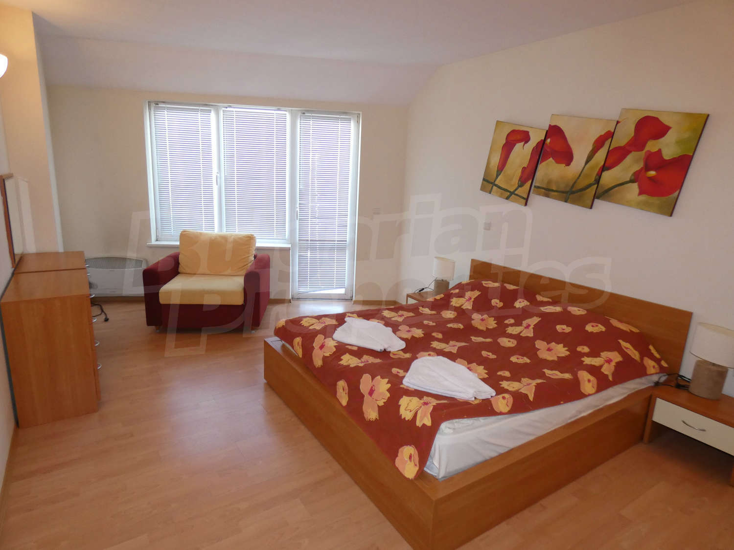 The apartment is set on the third floor in a building with a lift, with a total area of 100.89 sq.m., net area - 91.72 sq.m. It is heated by electrical convectors. The floorings are with laminate and the windows are PVC. The apartment is facing west / north and reveals picturesque views of Rila Mountain, forests and the village. The flat accommodates comfotably up to 6 adults or family with children. There are 2 bathrooms - one  with a bathtub, the other with a shower. The living room is furnished with a sofa bed, dinning-table  and fully equipped kitchenette (oven, electric hobs, microwave, fridge, toaster and kettle). Two separate bedrooms - one  with a double bed and wardrobe, the other - with two single beds and wardrobe. This apartment is also equipped with a ski locker. The maintenance fee is 12 € per m2.