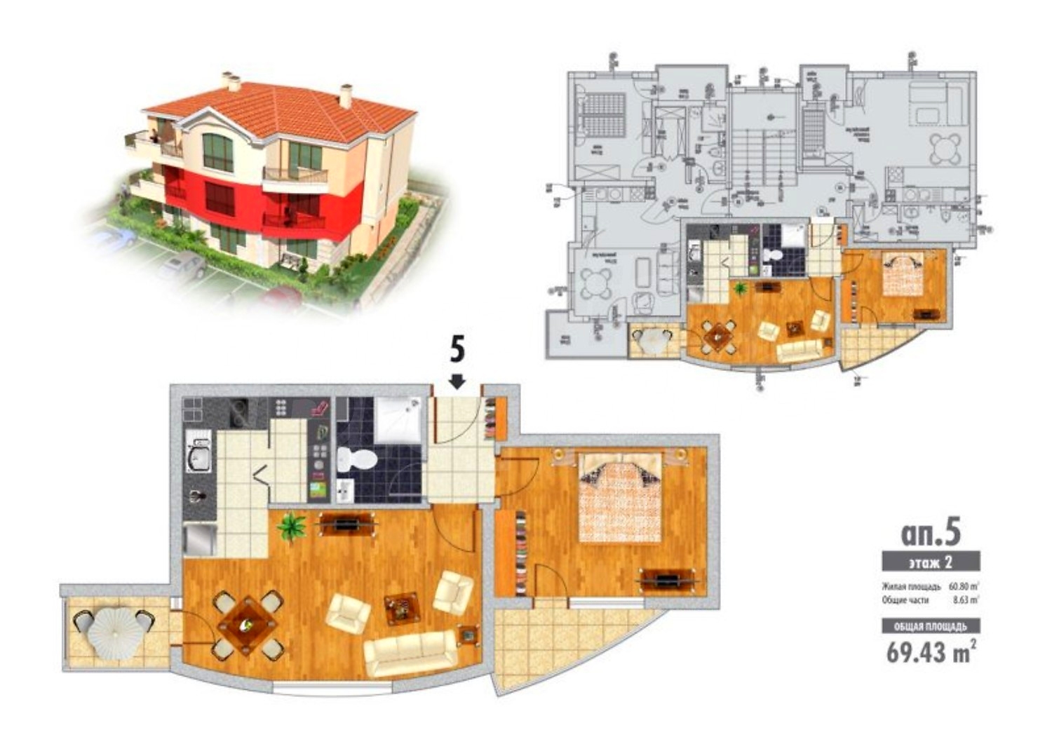 69.43 m2 (net area: 60.8 m2 plus common parts: 8.63 m2)