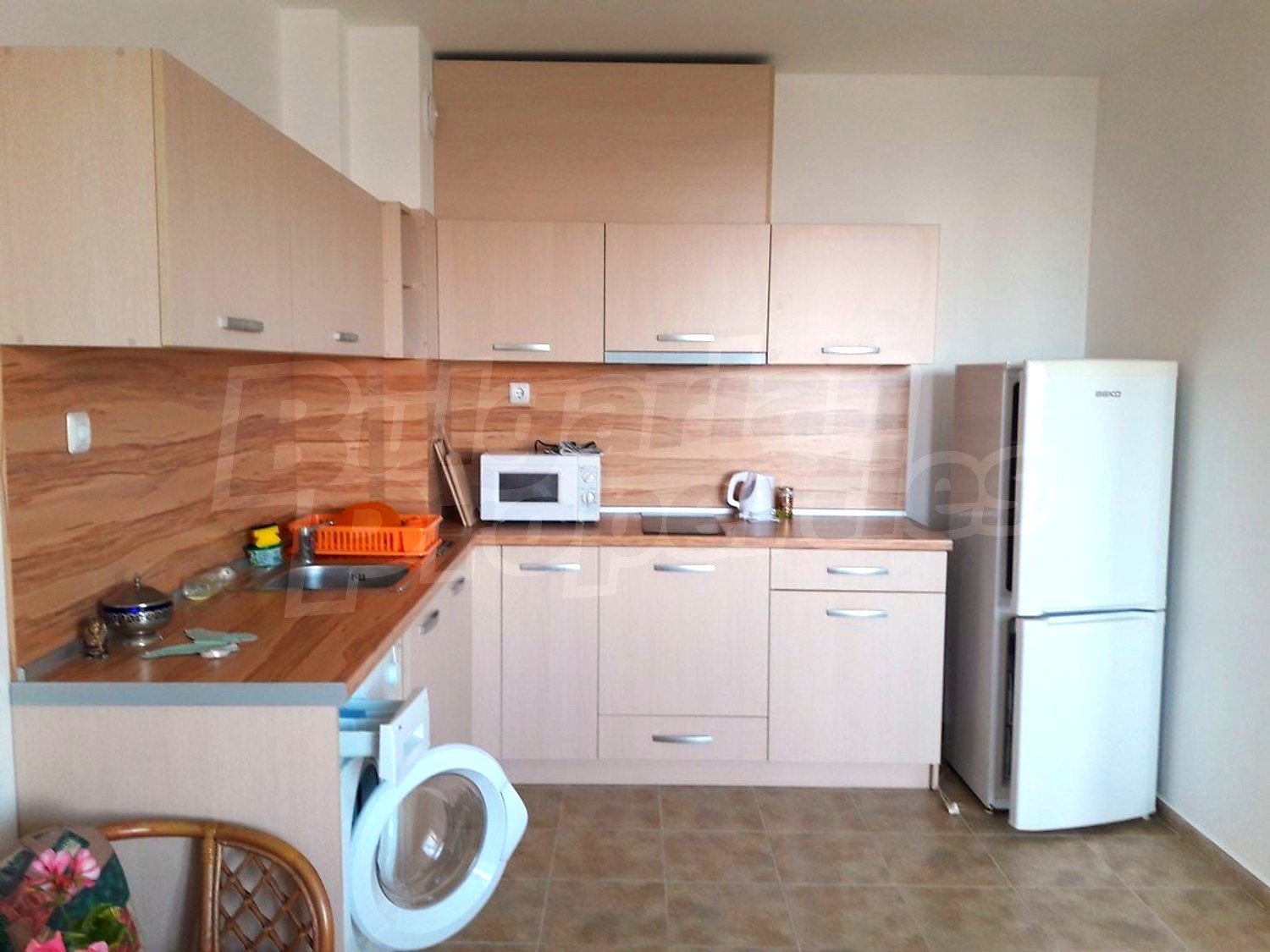 The property is sold fully furnished. Kitchenette with kitchen cupboards, ceramic hot plates, extractor hood, washing machine, fridge, dining table with chairs, sofa. Bedroom with large bed and wardrobe. Fully equipped bathroom.
