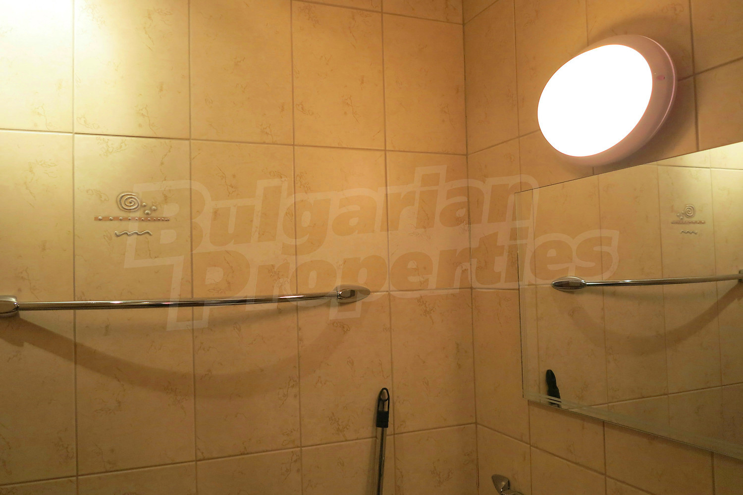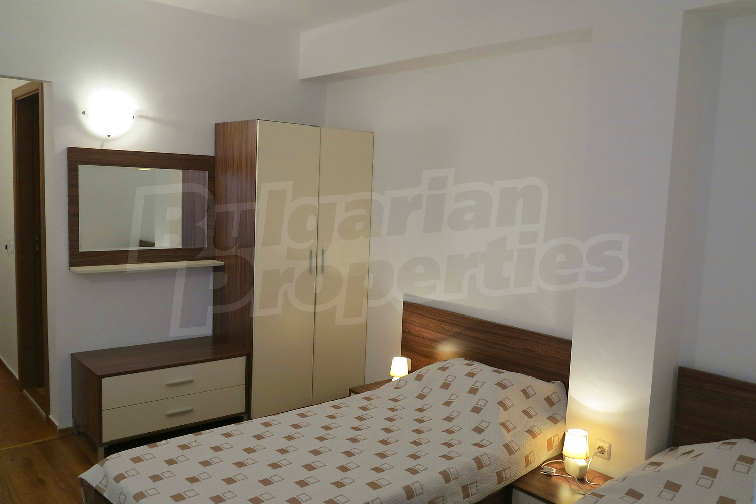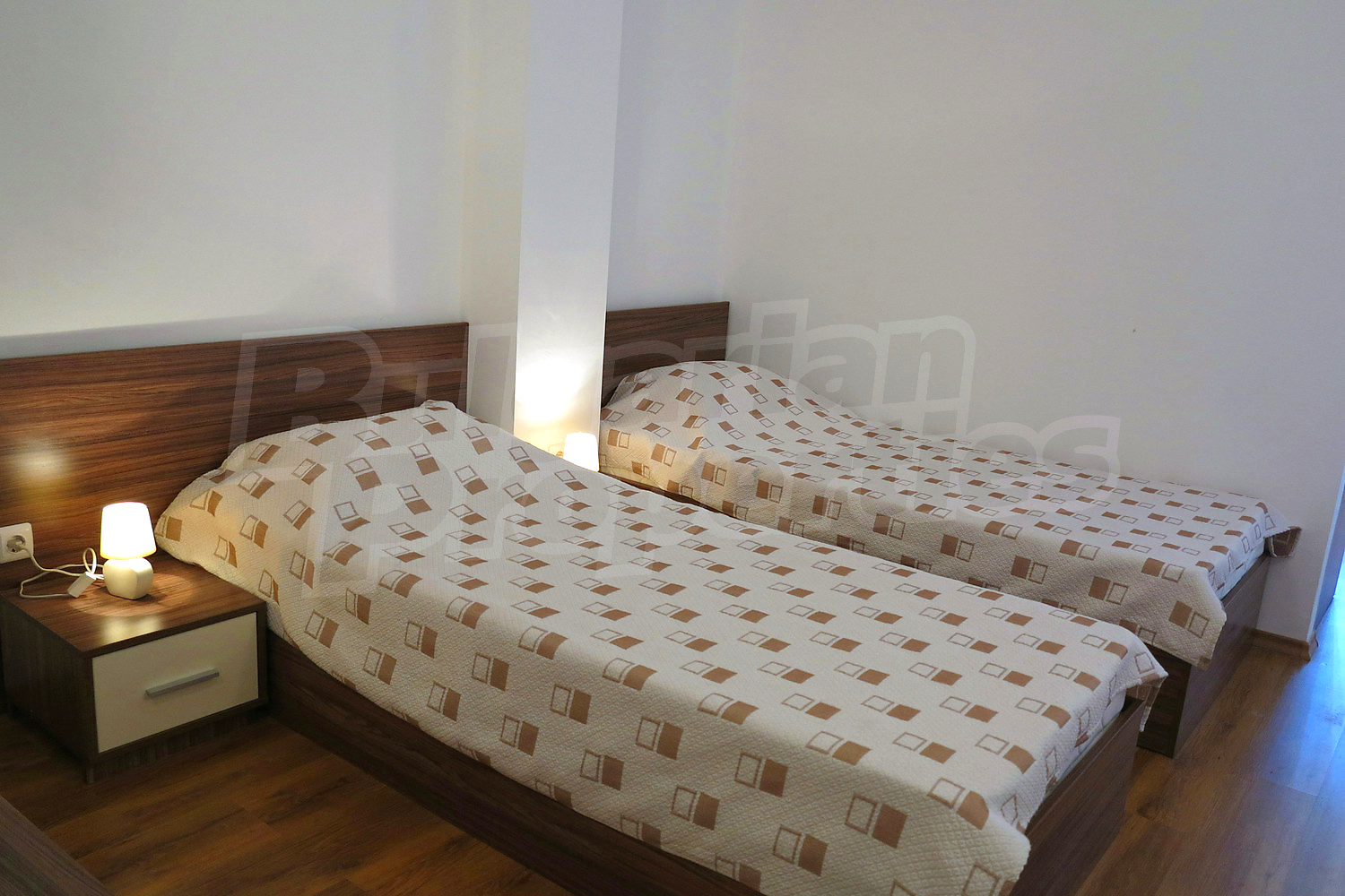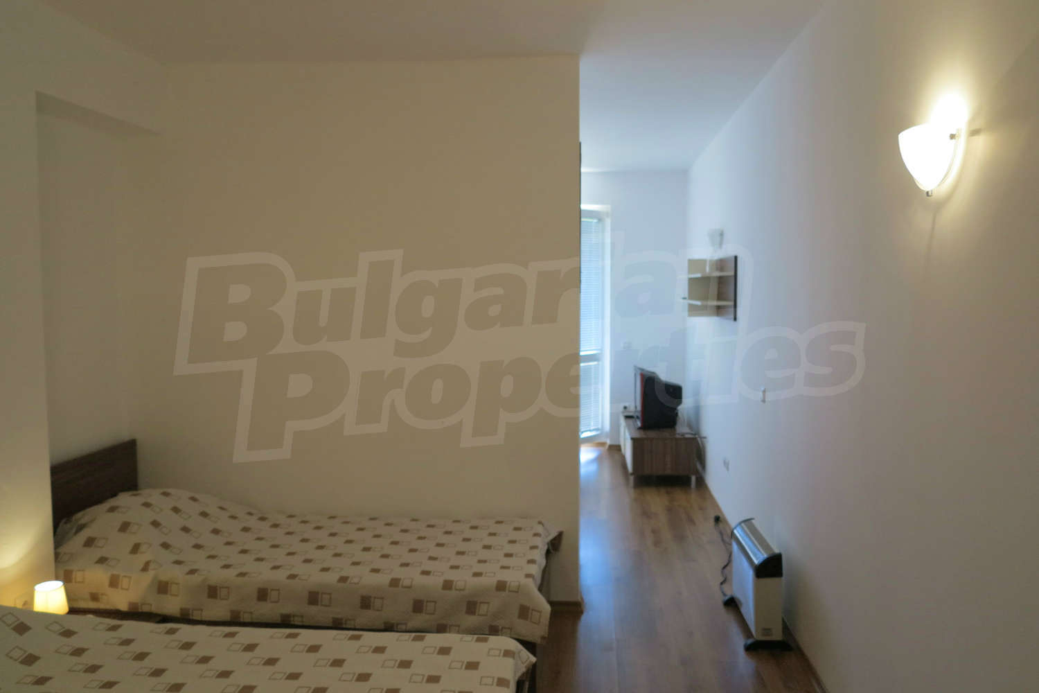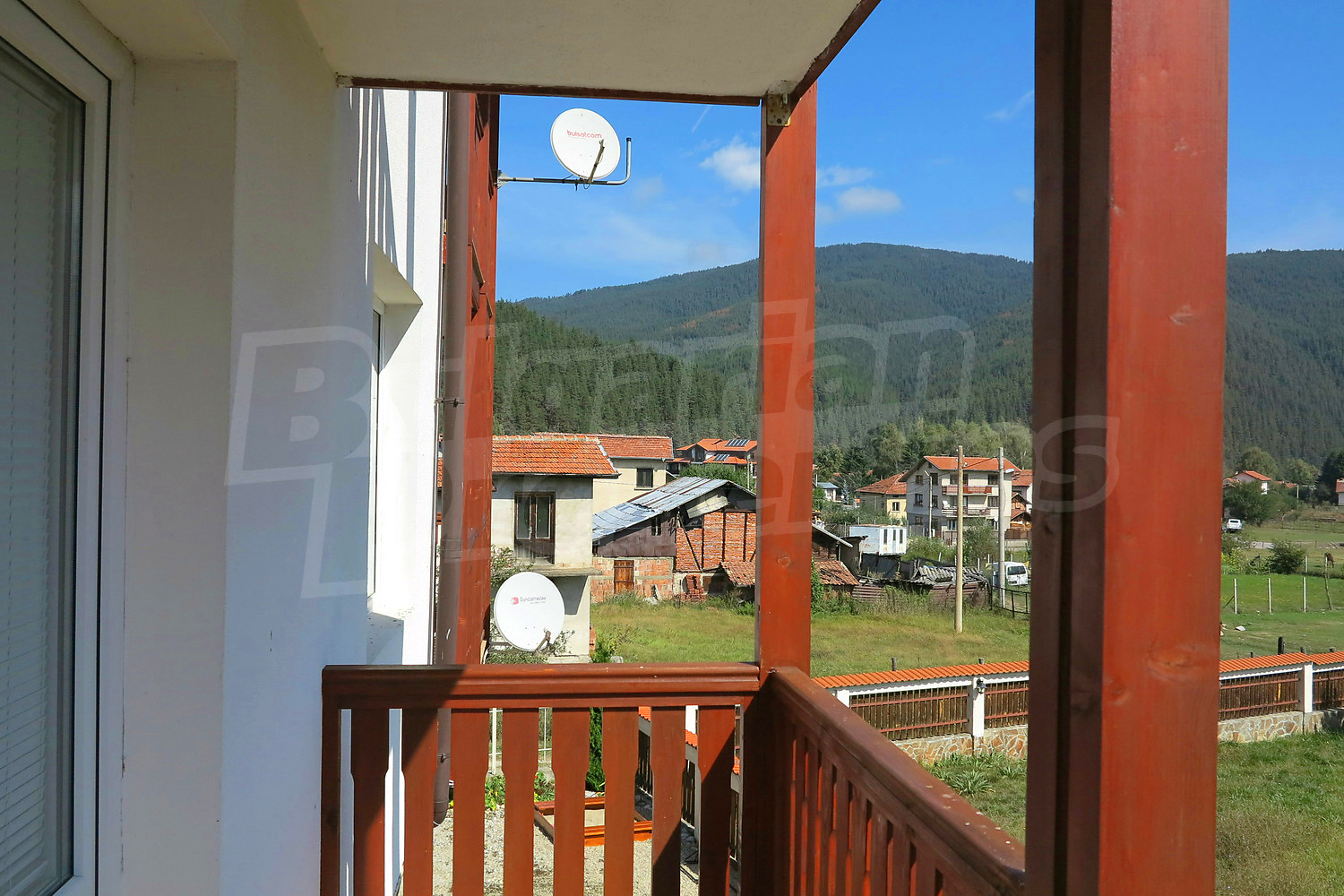 The apartment is located on the first floor with a living area - 37.46 sq.m. and common parts - 6.68 sq.m. The premises are facing east. The flat is finished with laminate flooring, painted walls and PVC joinery. The living room with kitchenette is completed with a ceramic hob, a sink, an oven, an extractor hood, a fridge, a sofa, a coffee table, a TV set; bedroom with two beds, bedside tables, a wardrobe and a chest of drawers; bathroom with a shower, a washbasin with mirror and a toilet. The balcony is one with magnificent views of the Rila Mountain, the forest and the village. The heating is by electric radiators. The building has an elevator and porter. The management fee is 10 euros / m2.