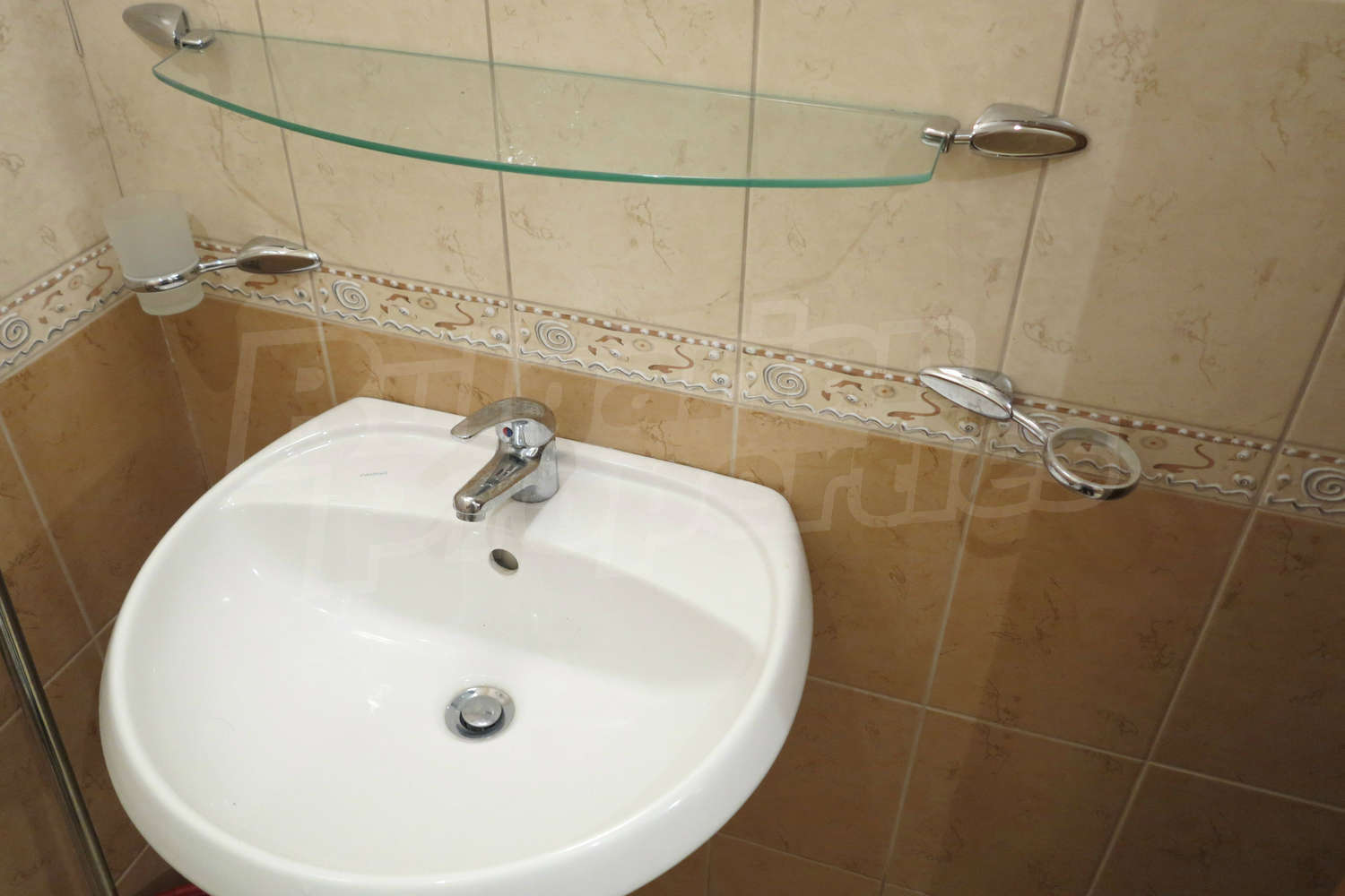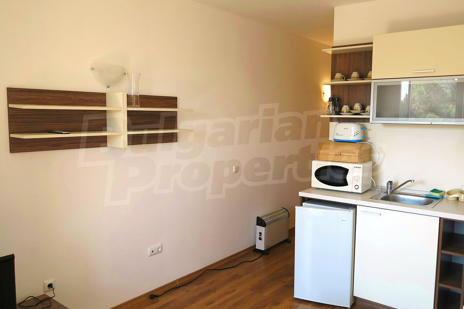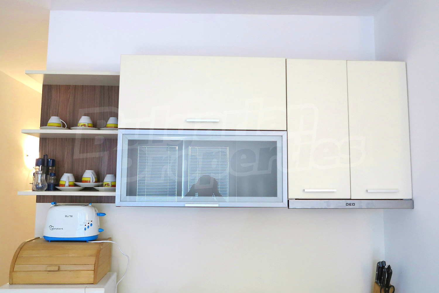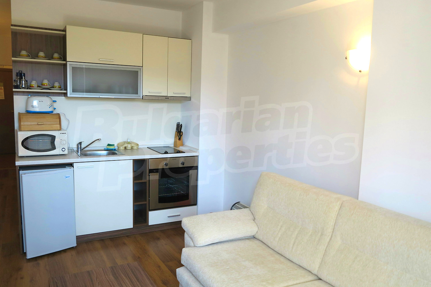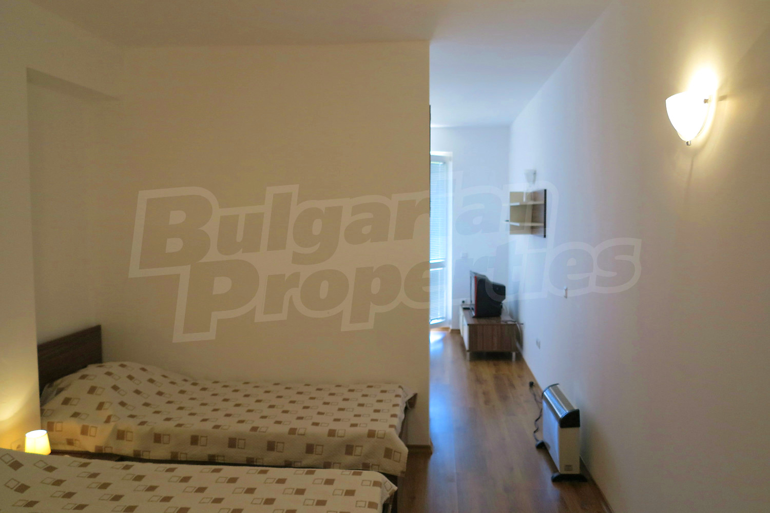 The apartment is located on the first floor with a living area - 37.46 sq.m. and common parts - 6.68 sq.m. The premises are facing east. The flat is finished with laminate flooring, painted walls and PVC joinery. The living room with kitchenette is completed with a ceramic hob, a sink, an oven, an extractor hood, a fridge, a sofa, a coffee table, a TV set; bedroom with two beds, bedside tables, a wardrobe and a chest of drawers; bathroom with a shower, a washbasin with mirror and a toilet. The balcony is one with magnificent views of the Rila Mountain, the forest and the village. The heating is by electric radiators. The building has an elevator and porter. The management fee is 10 euros / m2.
