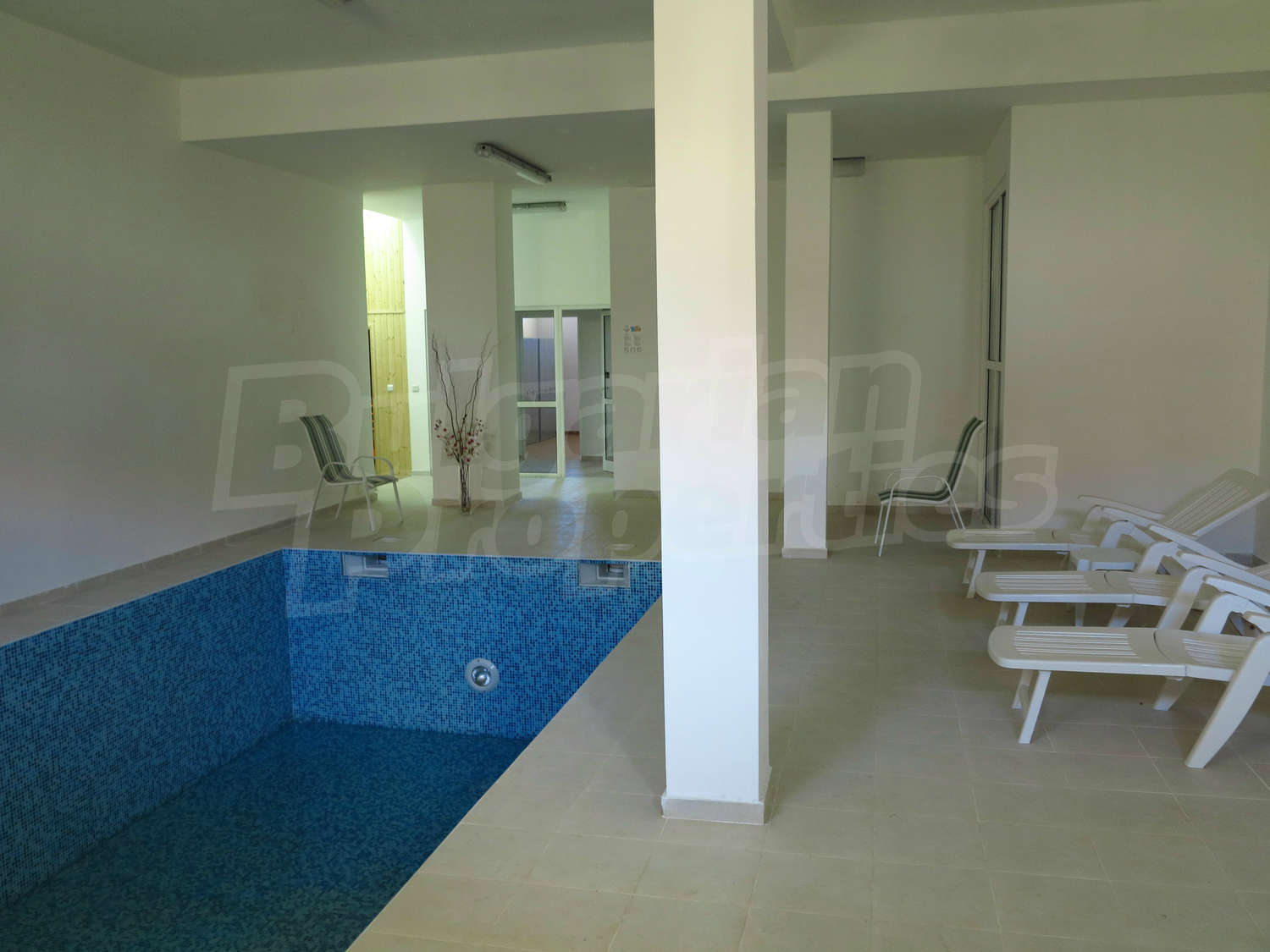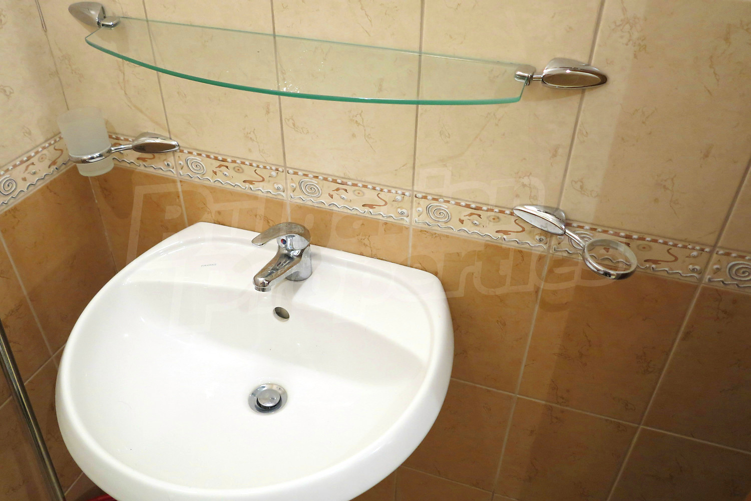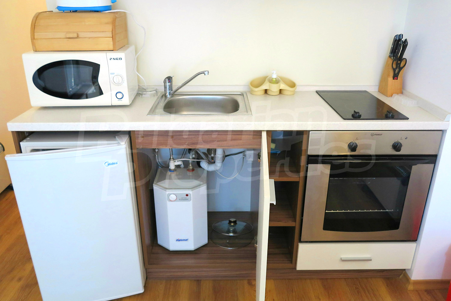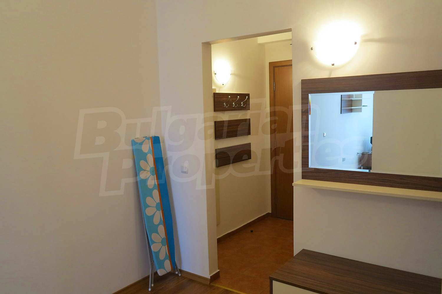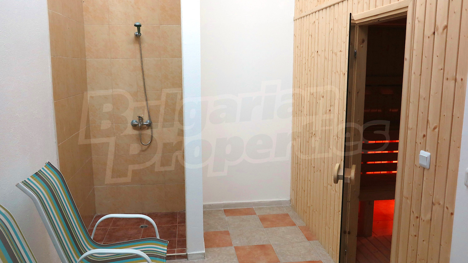 The apartment is located on the first floor with a living area - 37.46 sq.m. and common parts - 6.68 sq.m. The premises are facing east. The flat is finished with laminate flooring, painted walls and PVC joinery. The living room with kitchenette is completed with a ceramic hob, a sink, an oven, an extractor hood, a fridge, a sofa, a coffee table, a TV set; bedroom with two beds, bedside tables, a wardrobe and a chest of drawers; bathroom with a shower, a washbasin with mirror and a toilet. The balcony is one with magnificent views of the Rila Mountain, the forest and the village. The heating is by electric radiators. The building has an elevator and porter. The management fee is 10 euros / m2.