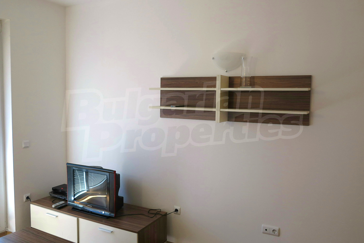 The apartment is located on the first floor with a living area - 37.46 sq.m. and common parts - 6.68 sq.m. The premises are facing east. The flat is finished with laminate flooring, painted walls and PVC joinery. The living room with kitchenette is completed with a ceramic hob, a sink, an oven, an extractor hood, a fridge, a sofa, a coffee table, a TV set; bedroom with two beds, bedside tables, a wardrobe and a chest of drawers; bathroom with a shower, a washbasin with mirror and a toilet. The balcony is one with magnificent views of the Rila Mountain, the forest and the village. The heating is by electric radiators. The building has an elevator and porter. The management fee is 10 euros / m2.