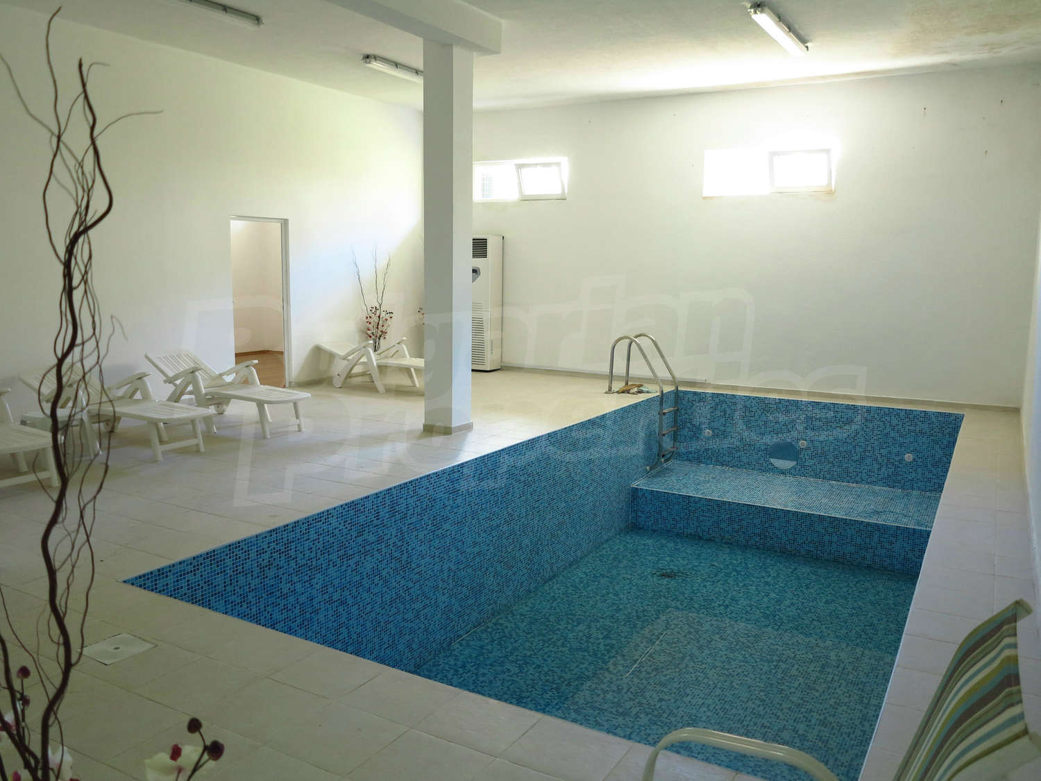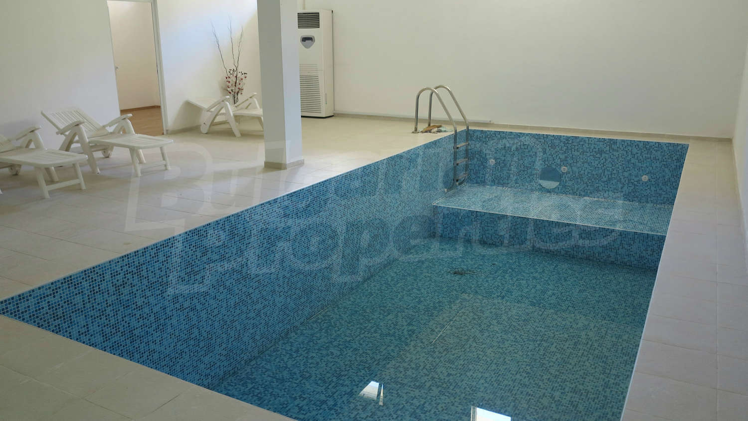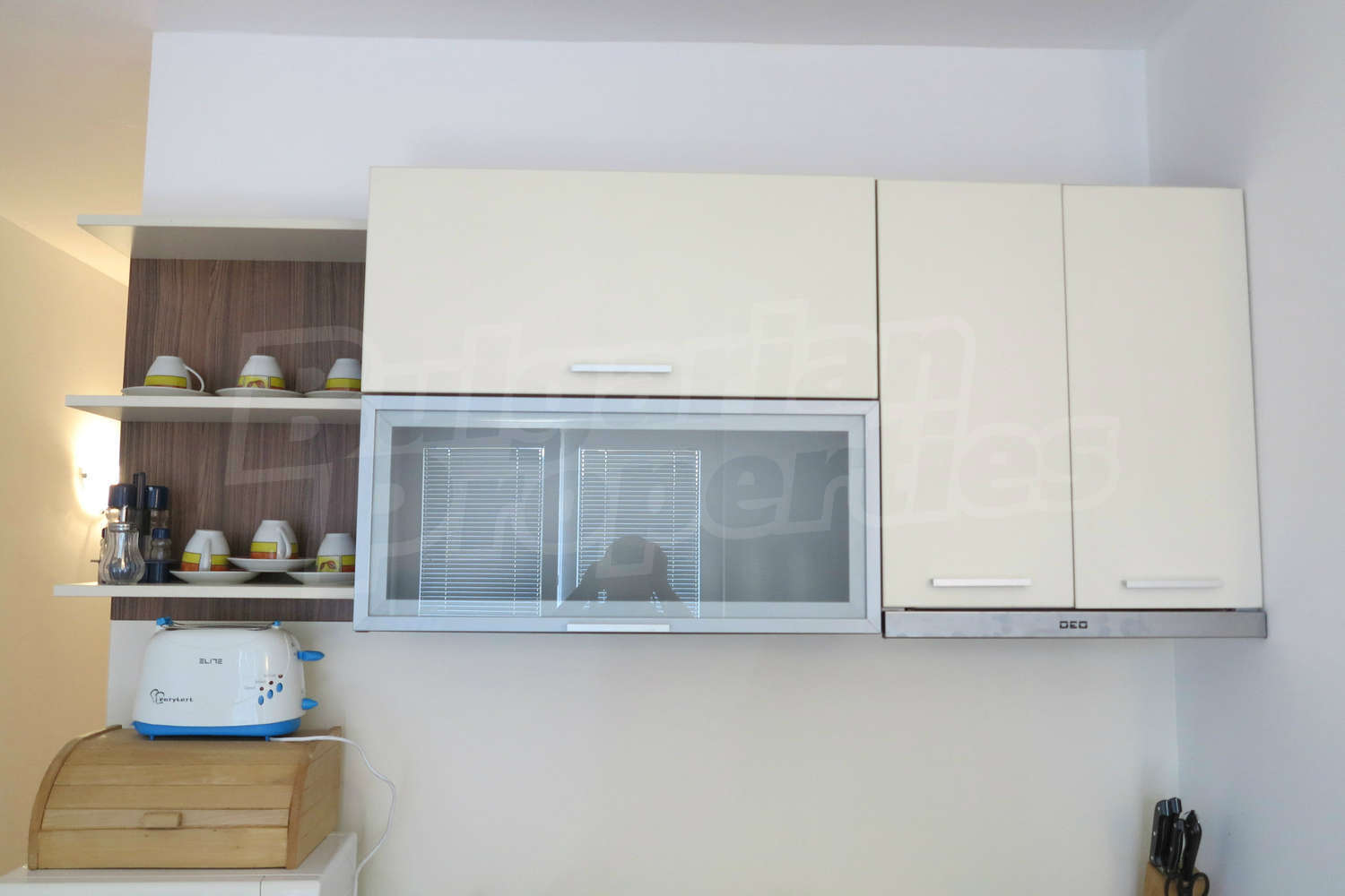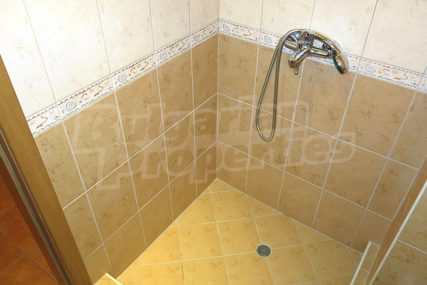 The apartment is located on the first floor with a living area - 37.46 sq.m. and common parts - 6.68 sq.m. The premises are facing east. The flat is finished with laminate flooring, painted walls and PVC joinery. The living room with kitchenette is completed with a ceramic hob, a sink, an oven, an extractor hood, a fridge, a sofa, a coffee table, a TV set; bedroom with two beds, bedside tables, a wardrobe and a chest of drawers; bathroom with a shower, a washbasin with mirror and a toilet. The balcony is one with magnificent views of the Rila Mountain, the forest and the village. The heating is by electric radiators. The building has an elevator and porter. The management fee is 10 euros / m2.