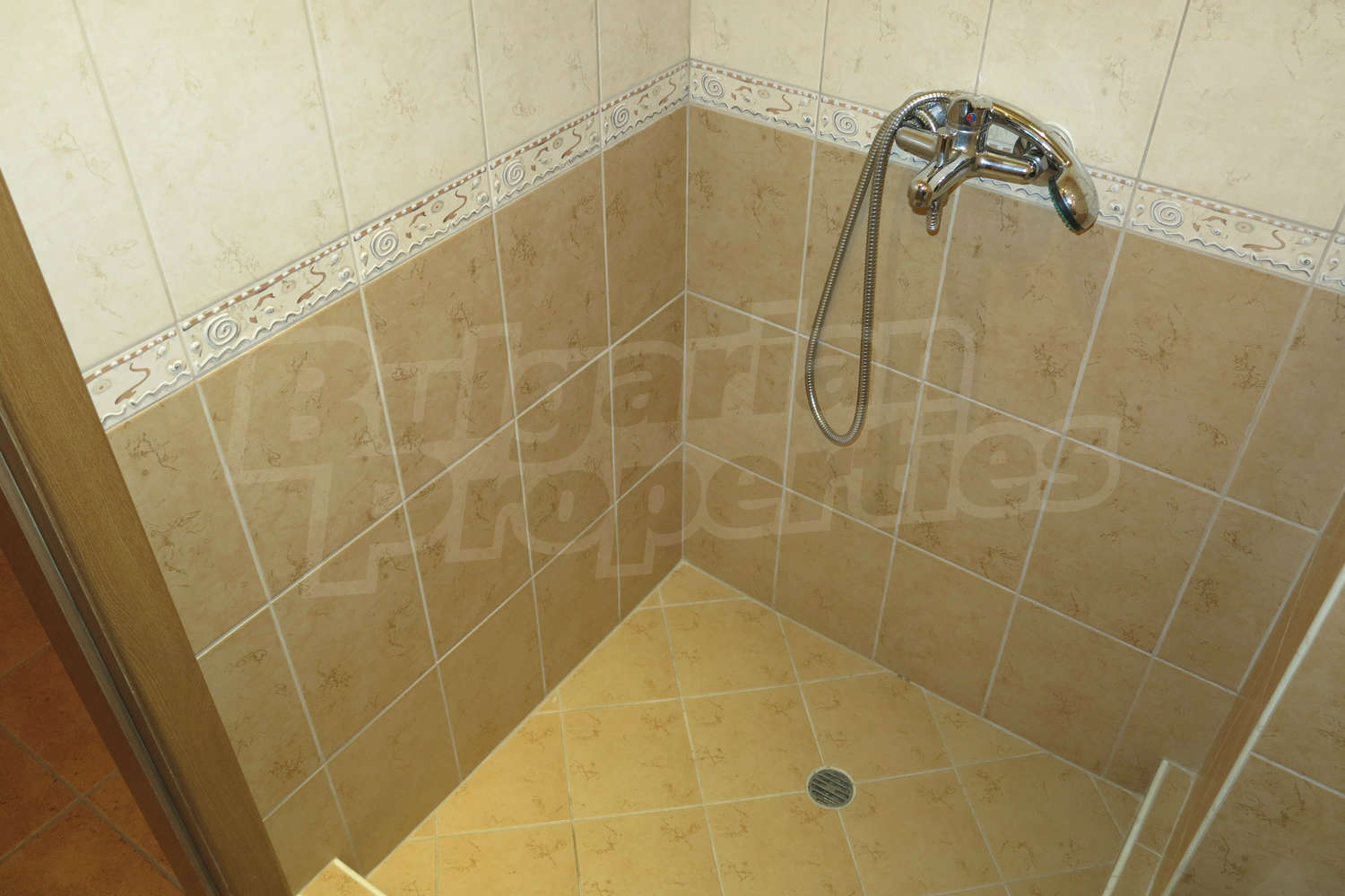 The apartment is located on the first floor with a living area - 37.46 sq.m. and common parts - 6.68 sq.m. The premises are facing east. The flat is finished with laminate flooring, painted walls and PVC joinery. The living room with kitchenette is completed with a ceramic hob, a sink, an oven, an extractor hood, a fridge, a sofa, a coffee table, a TV set; bedroom with two beds, bedside tables, a wardrobe and a chest of drawers; bathroom with a shower, a washbasin with mirror and a toilet. The balcony is one with magnificent views of the Rila Mountain, the forest and the village. The heating is by electric radiators. The building has an elevator and porter. The management fee is 10 euros / m2.