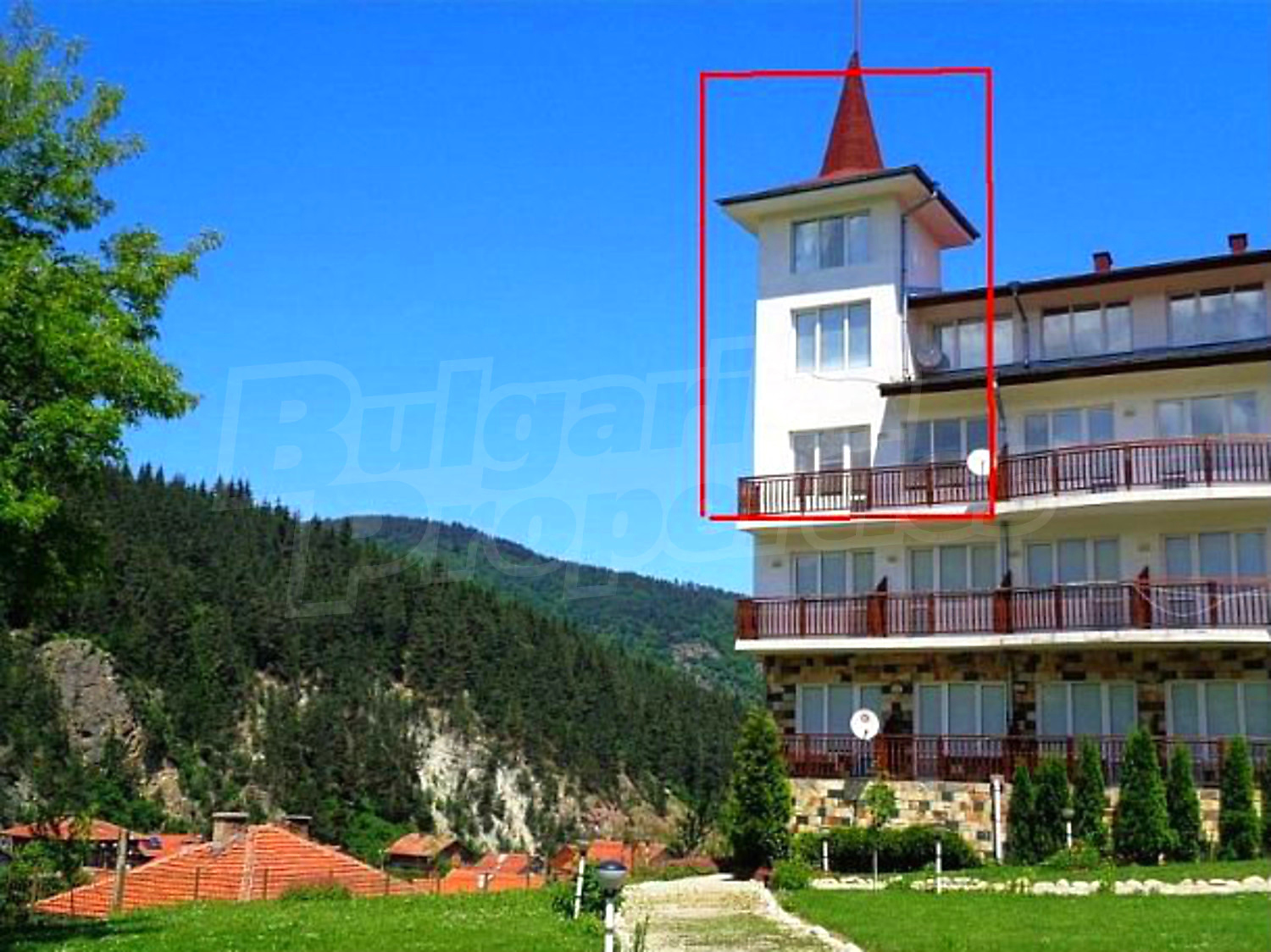 Exceptional 3-level mountain property with own private tower and beautiful panoramic views of the mountain and the inner yard of Eagle Rock gated complex, nestled in the picturesque village of Beli Iskar, 1 km away from Rila National Park and Beli Iskar eco path, 6 km from ski resort Borovets and Yastrebets ski area, 10 km from Malyovitsa resort, 7 km from the town of Samokov and 70 km from the airport in Sofia. The complex is built at a height so that even the ground floor is above the roofs of the surrounding village of Beli Iskar.