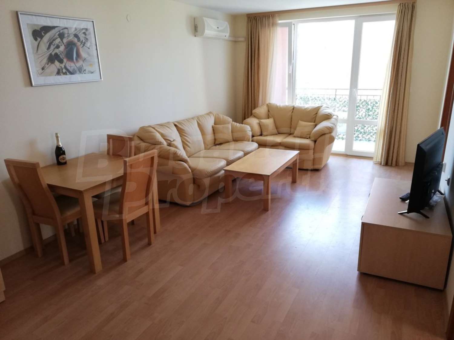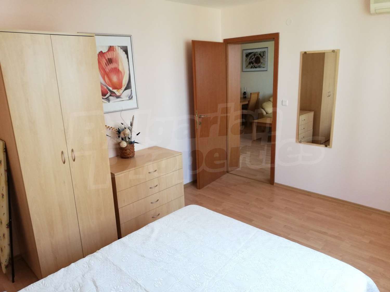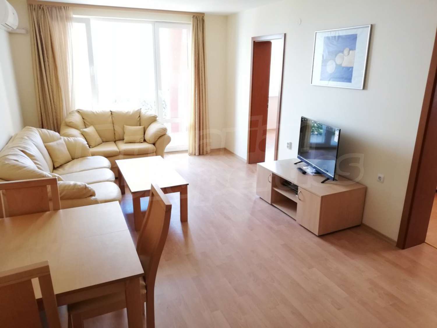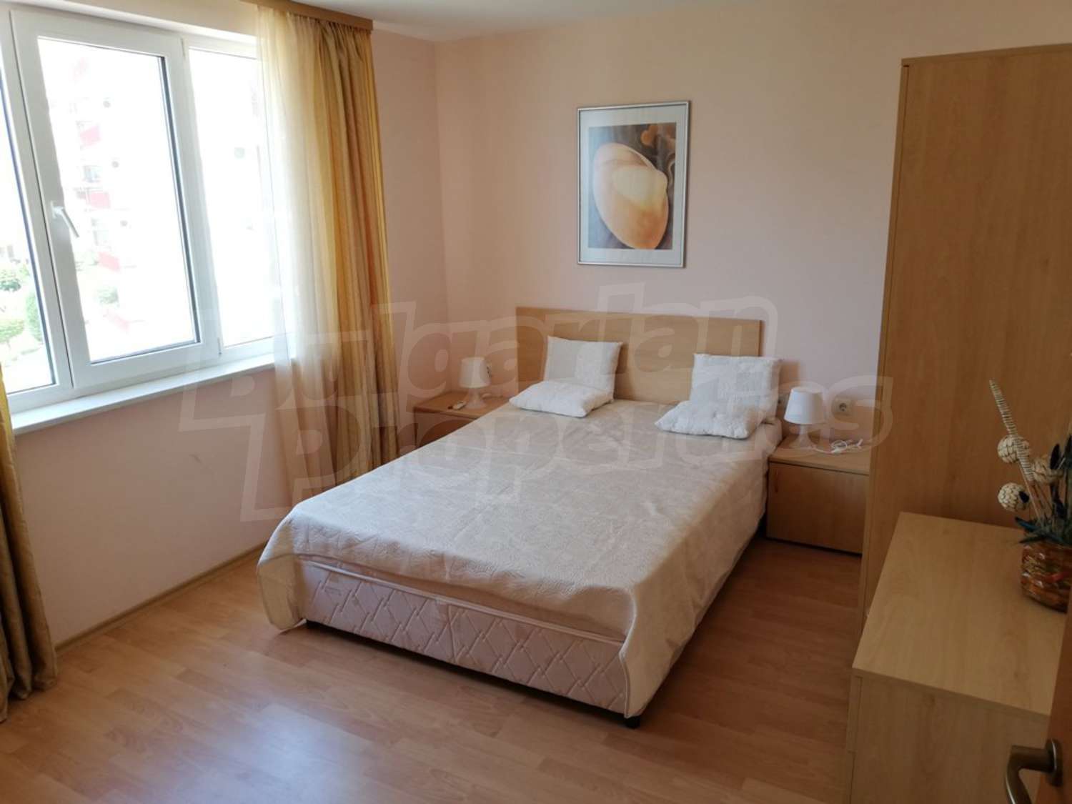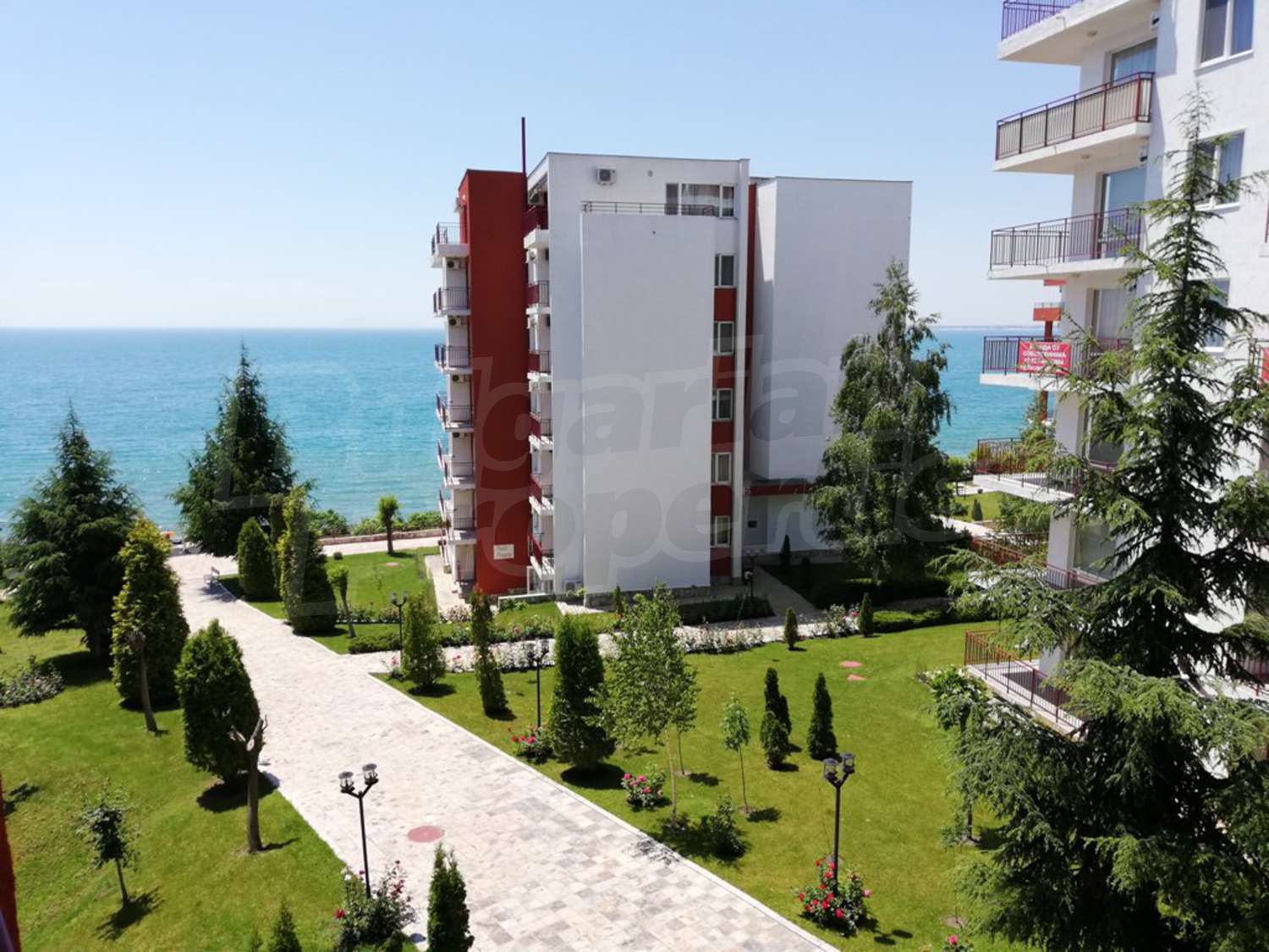 Furnished two-bedroom apartment with magnificent sea view located on the first line of the sea (20 m) and the beach of Panorama Fort Noks complex, 8 km from Sunny Beach. The complex is located in the quiet and beautiful area between Sveti Vlas and Elenite resorts, directly on the beach, with gorgeous sea view overlooking Sunny Beach and the old town of Nessebar, only 1 km from Marina Dinevi.
