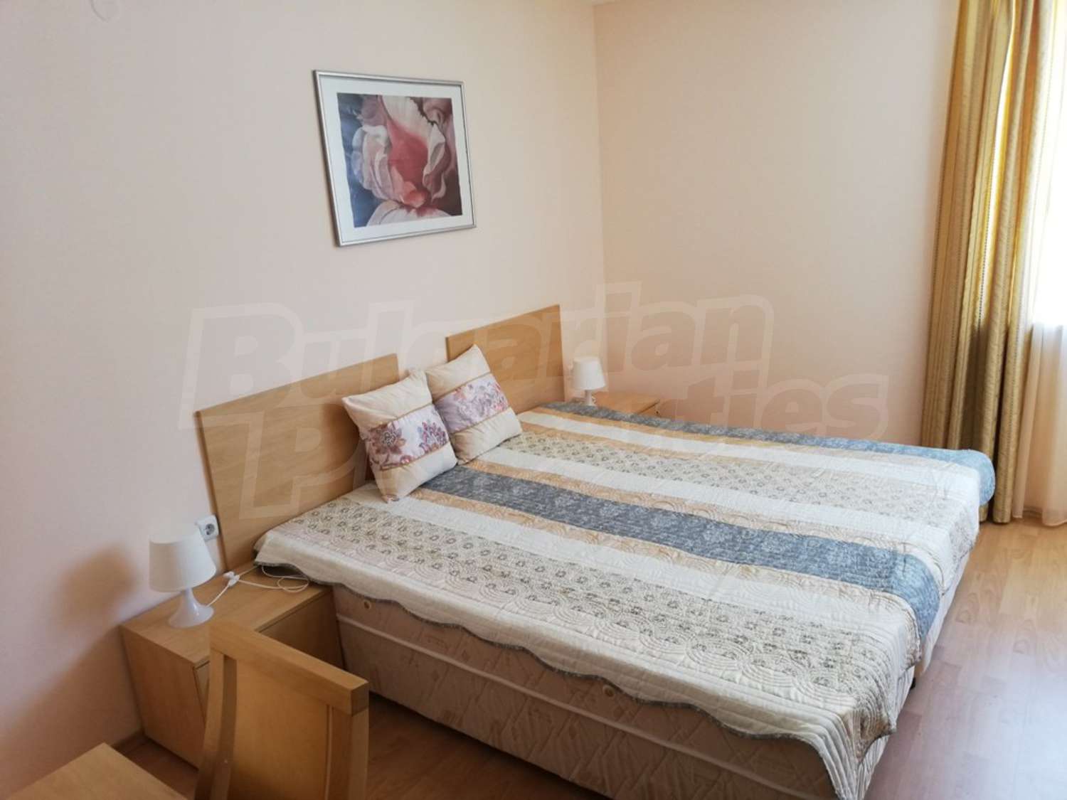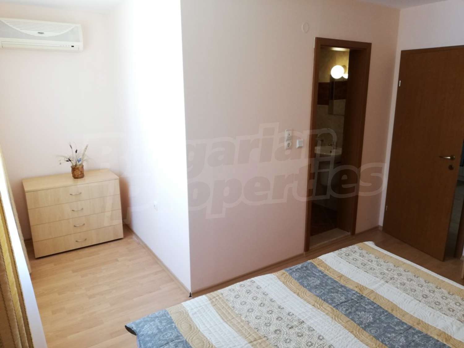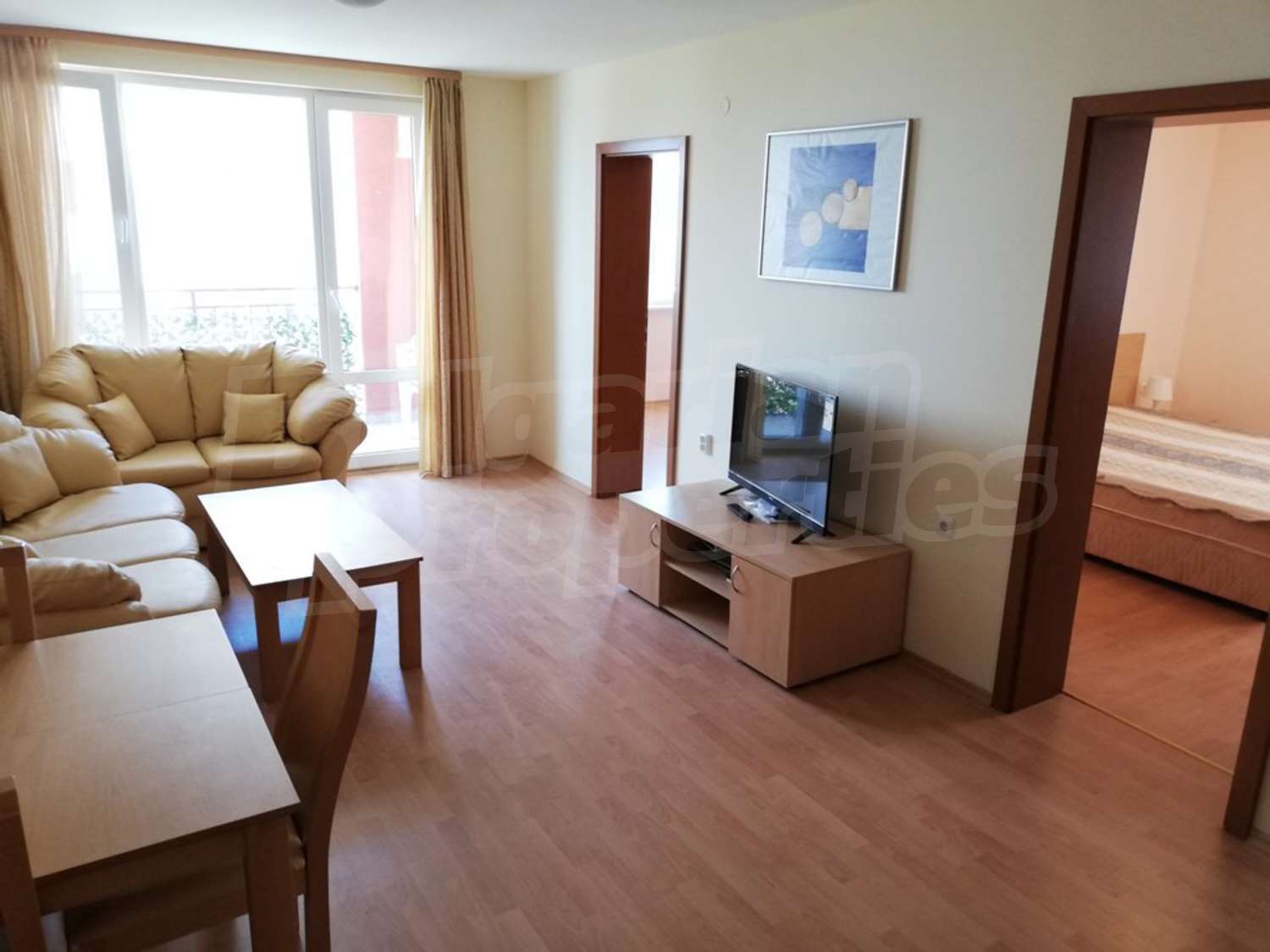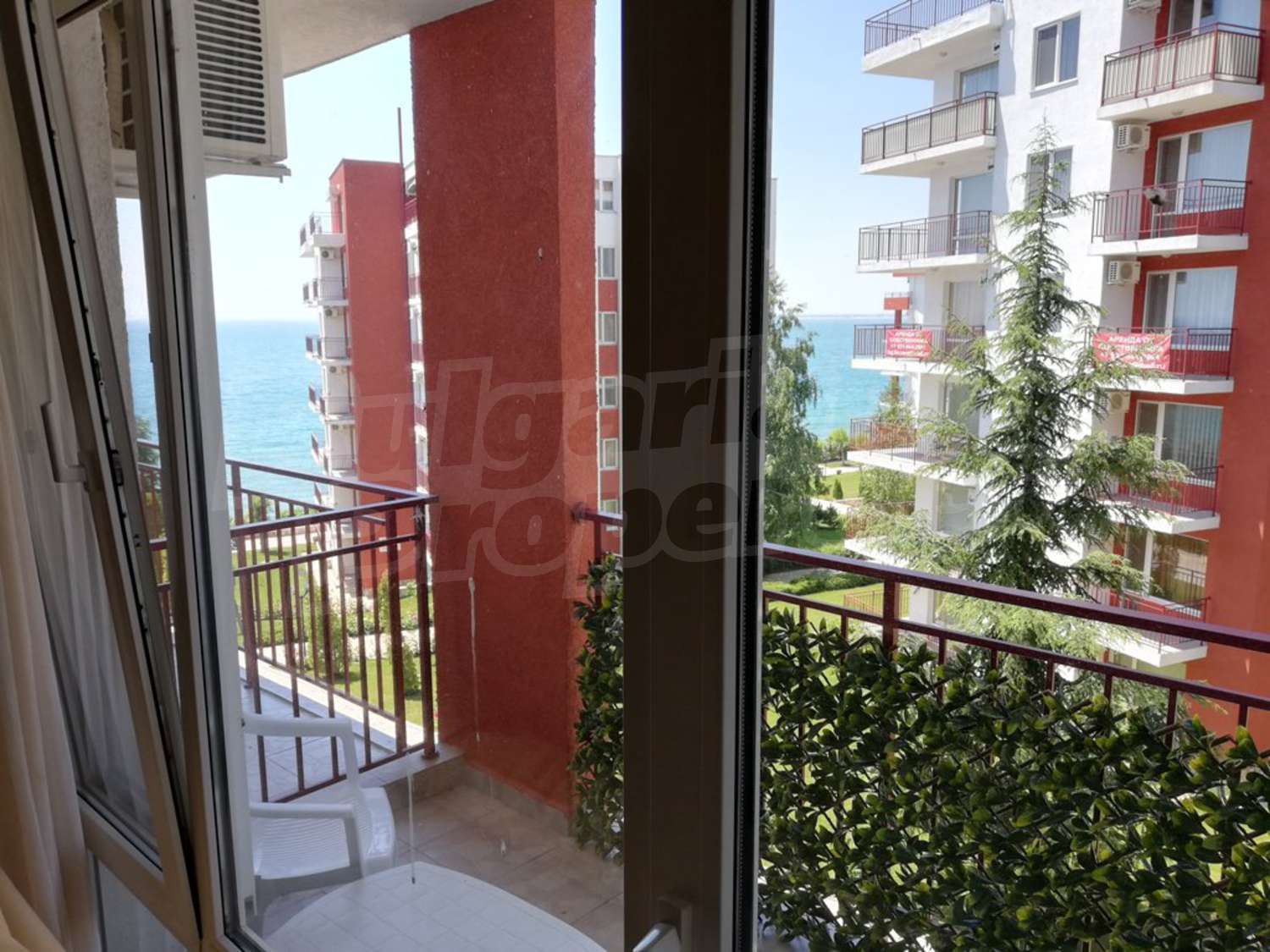 Furnished two-bedroom apartment with magnificent sea view located on the first line of the sea (20 m) and the beach of Panorama Fort Noks complex, 8 km from Sunny Beach. The complex is located in the quiet and beautiful area between Sveti Vlas and Elenite resorts, directly on the beach, with gorgeous sea view overlooking Sunny Beach and the old town of Nessebar, only 1 km from Marina Dinevi.