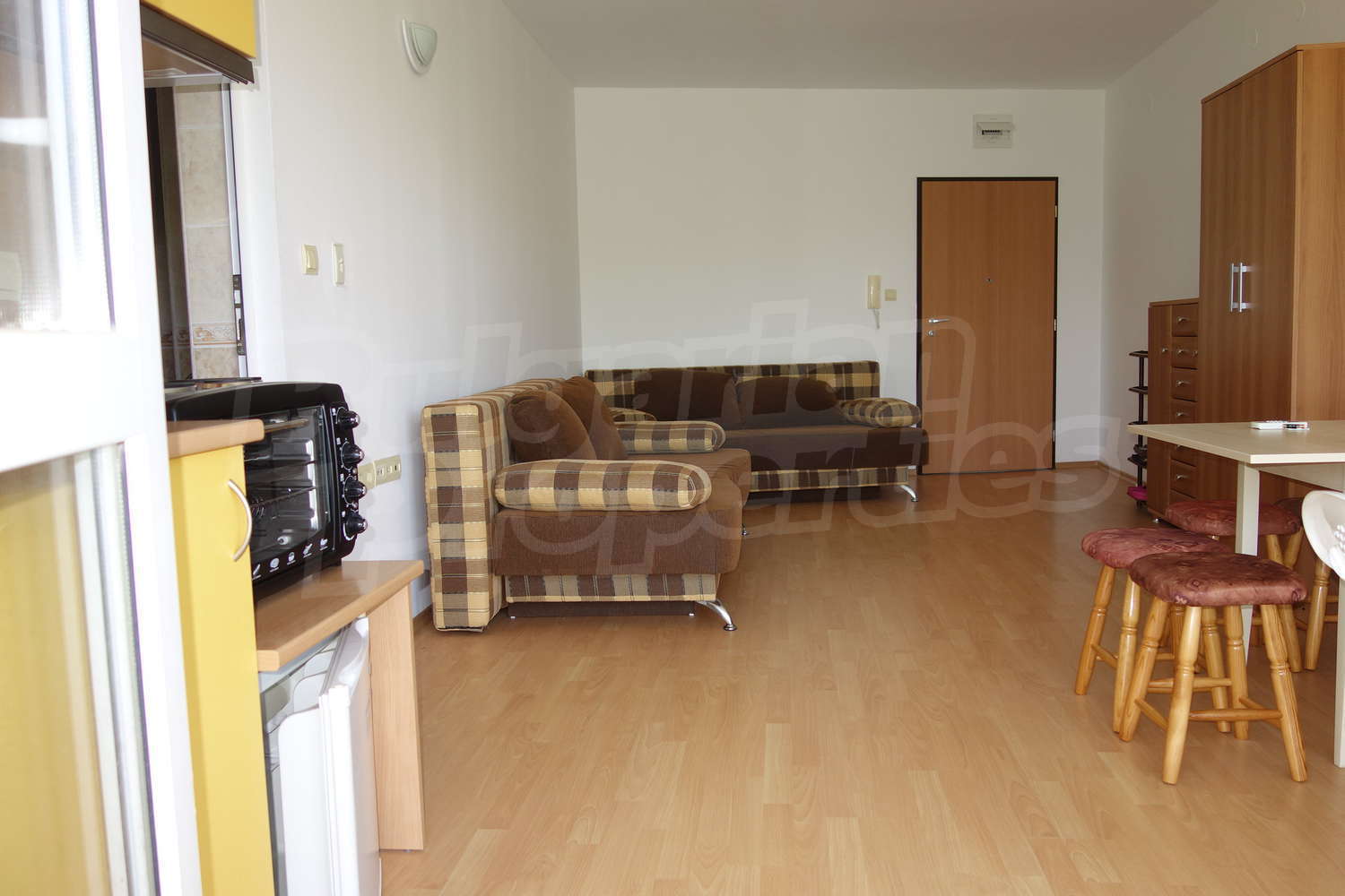 Fully furnished studio in a quiet and green location, 150 meters from the beach in Byala. The apartment is part of an excellently maintained building with year-round living families. The beach is two minutes from the building and nearby restaurants and grocery store.