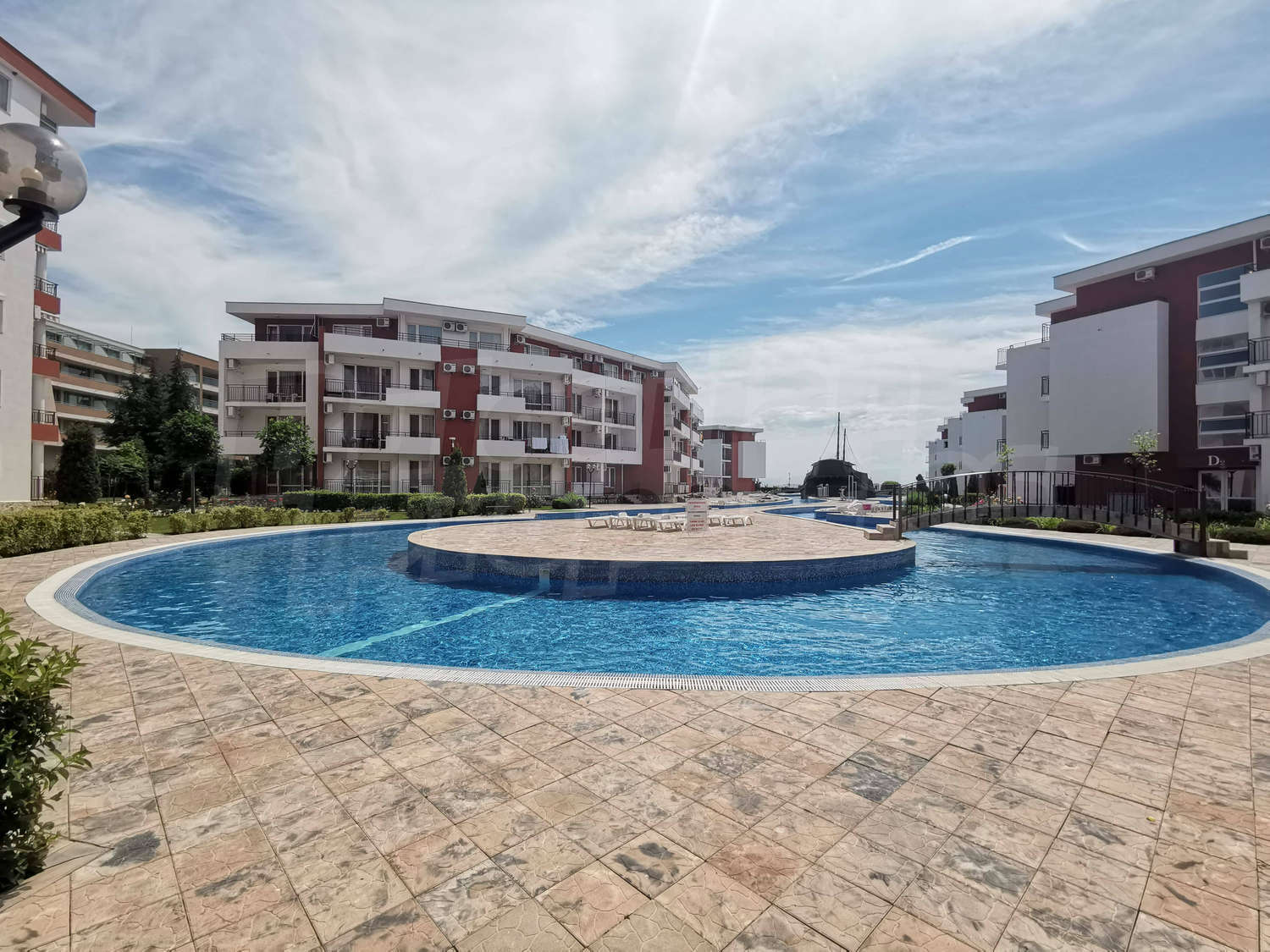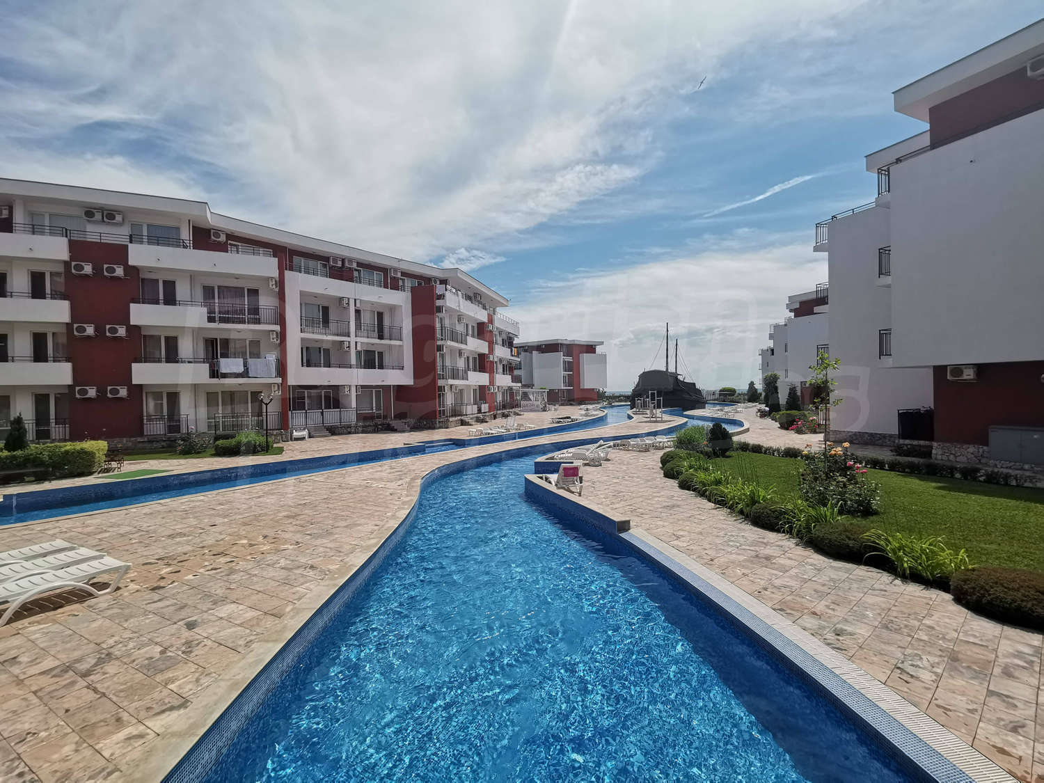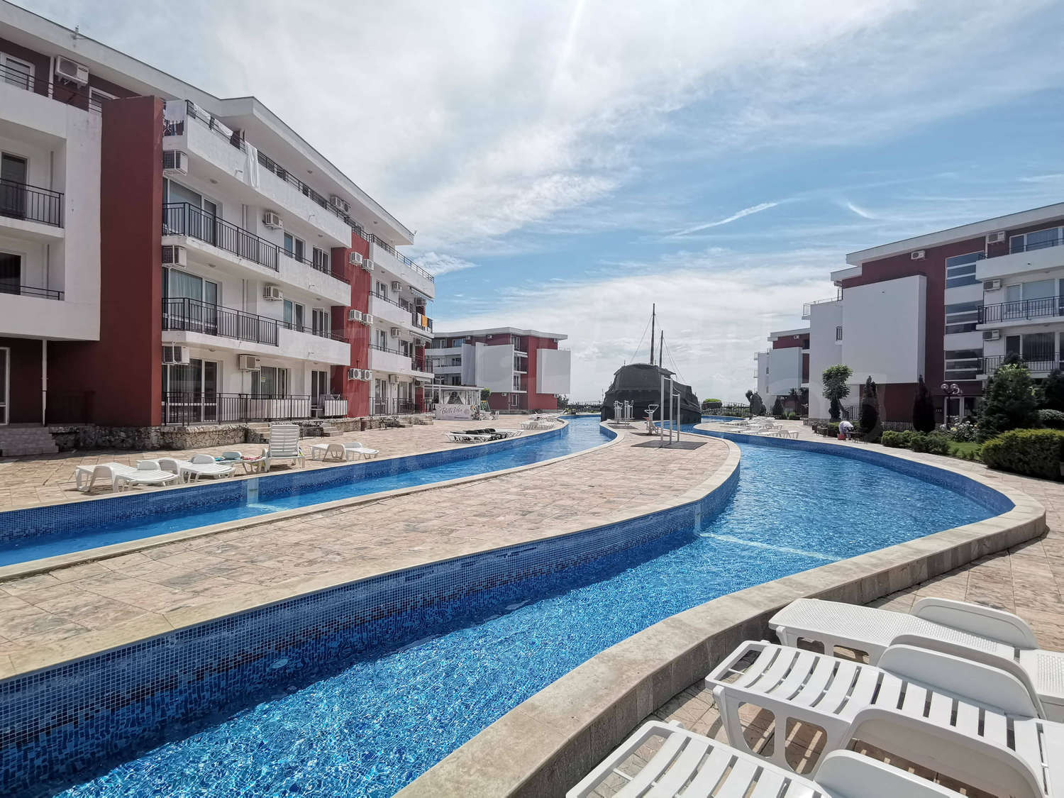 Fully furnished and equipped studio on the first line (50 m from the beach) in gated complex Privilege Fort Beach. The proximity to the sea, aqua park, supermarket and bus stop, make the complex an ideal place for summer holidays. Annual maintenance fee - EUR 12 per m2.