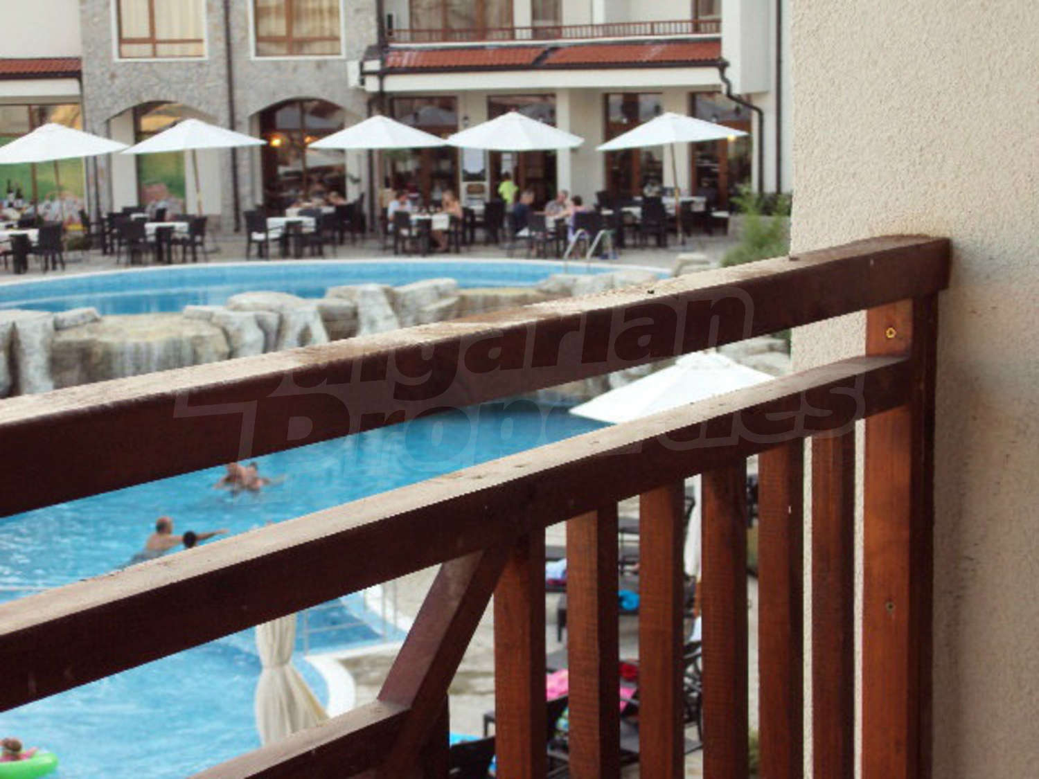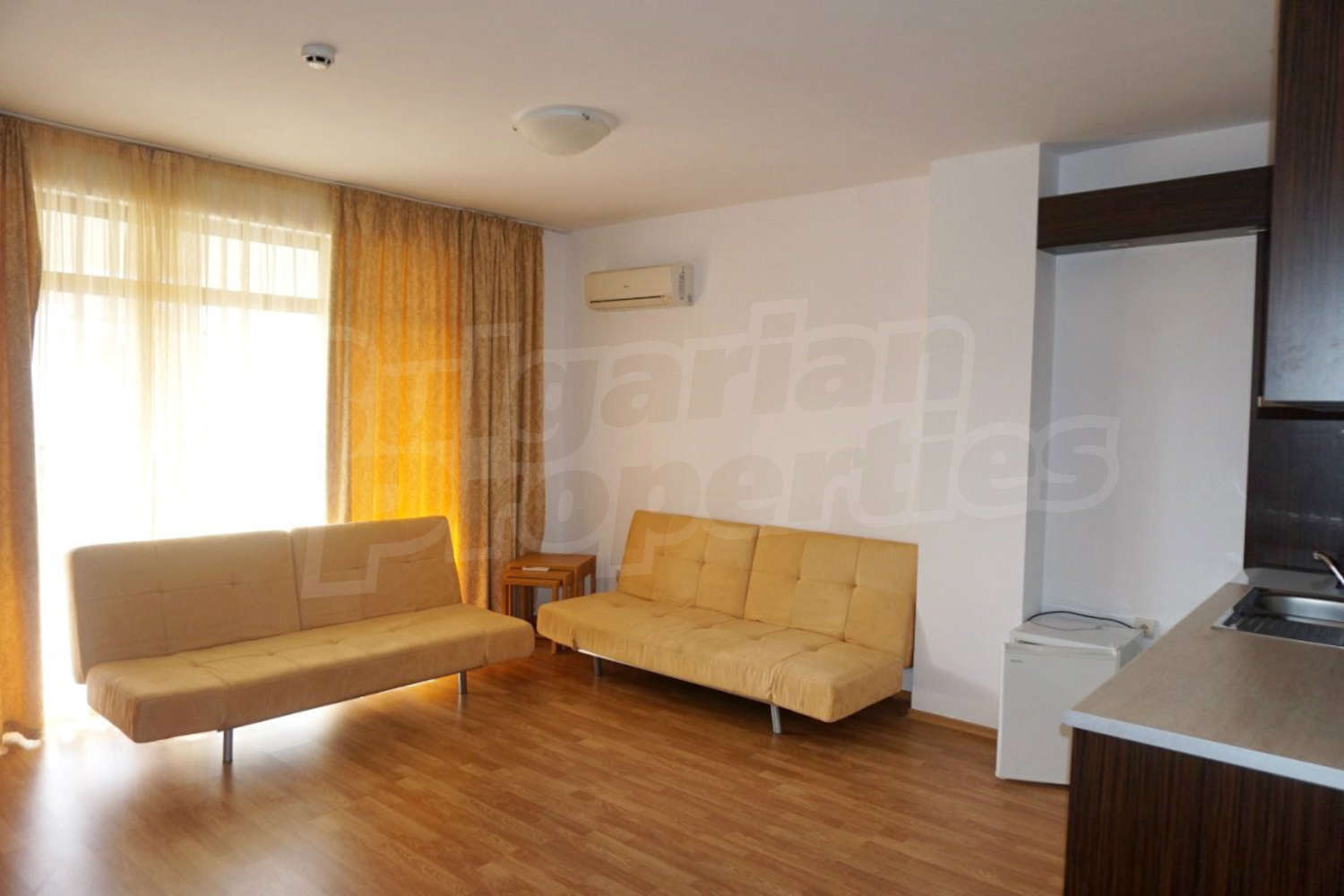 The apartment is located on the 2nd floor. This comfortably furnished apartment includes a living room, fully equipped kitchenette with all necessary appliances and table with chairs, sofas and a TV, air conditioner, a bathroom with toilet and a bath tub and a balcony with beautiful views of the inner yard and the outdoor swimming pool.