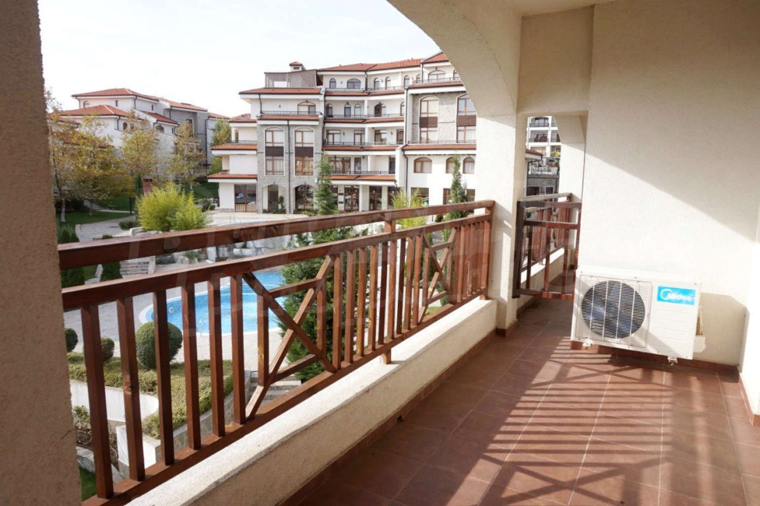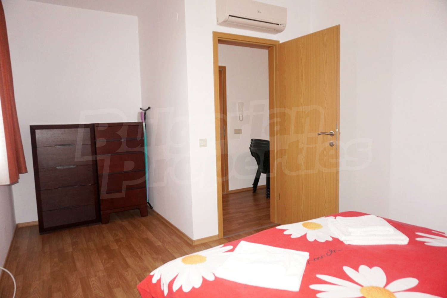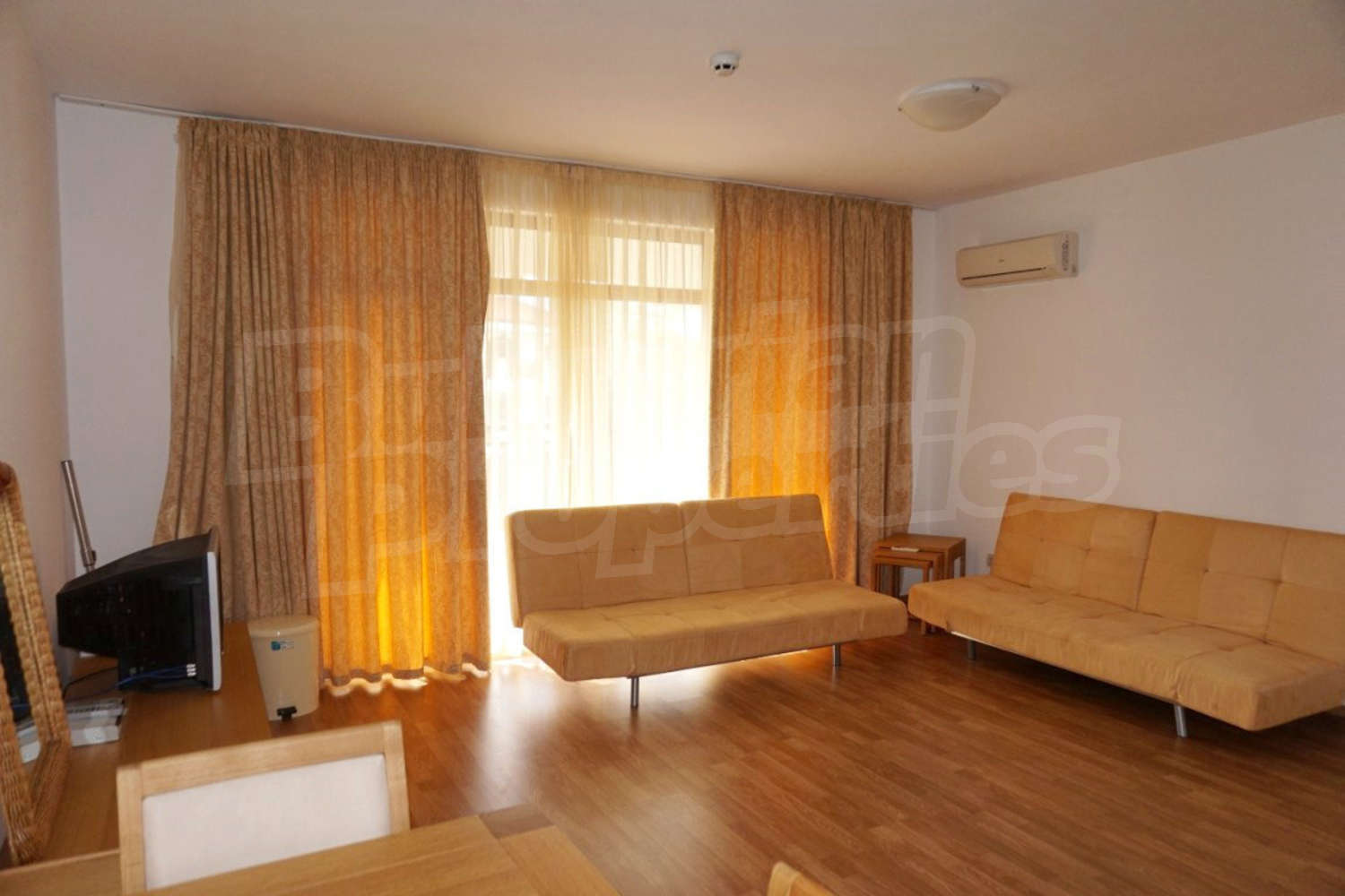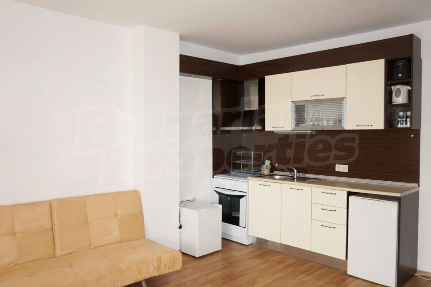 The apartment is located on the 2nd floor. This comfortably furnished apartment includes a living room, fully equipped kitchenette with all necessary appliances and table with chairs, sofas and a TV, air conditioner, a bathroom with toilet and a bath tub and a balcony with beautiful views of the inner yard and the outdoor swimming pool.